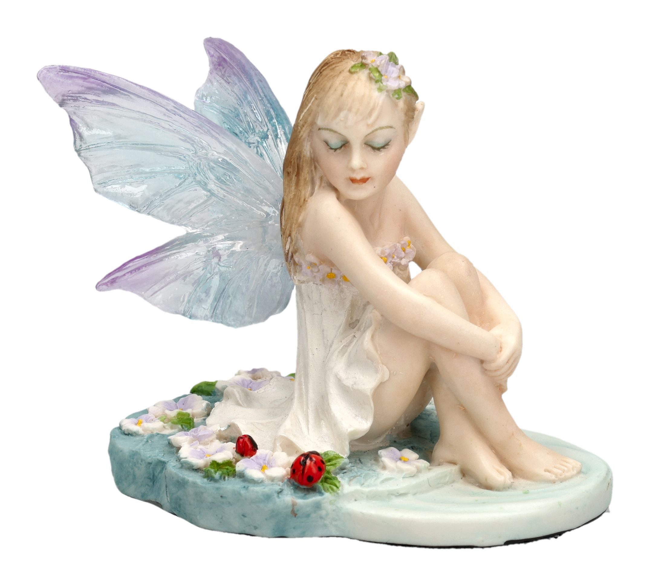 Ein zauberhafter Sommermoment – eingefangen in einer kunstvollen Miniatur: Die Feenfigur Jenna bringt die Magie der Natur direkt ins Zuhause. Mit durchscheinenden Flügeln und einem zart pastellfarbenen Kleid sitzt Jenna verträumt im Lilienfeld am Teich und beobachtet zwei Marienkäfer – ein poetisches Bild, das Märchenfans begeistert.