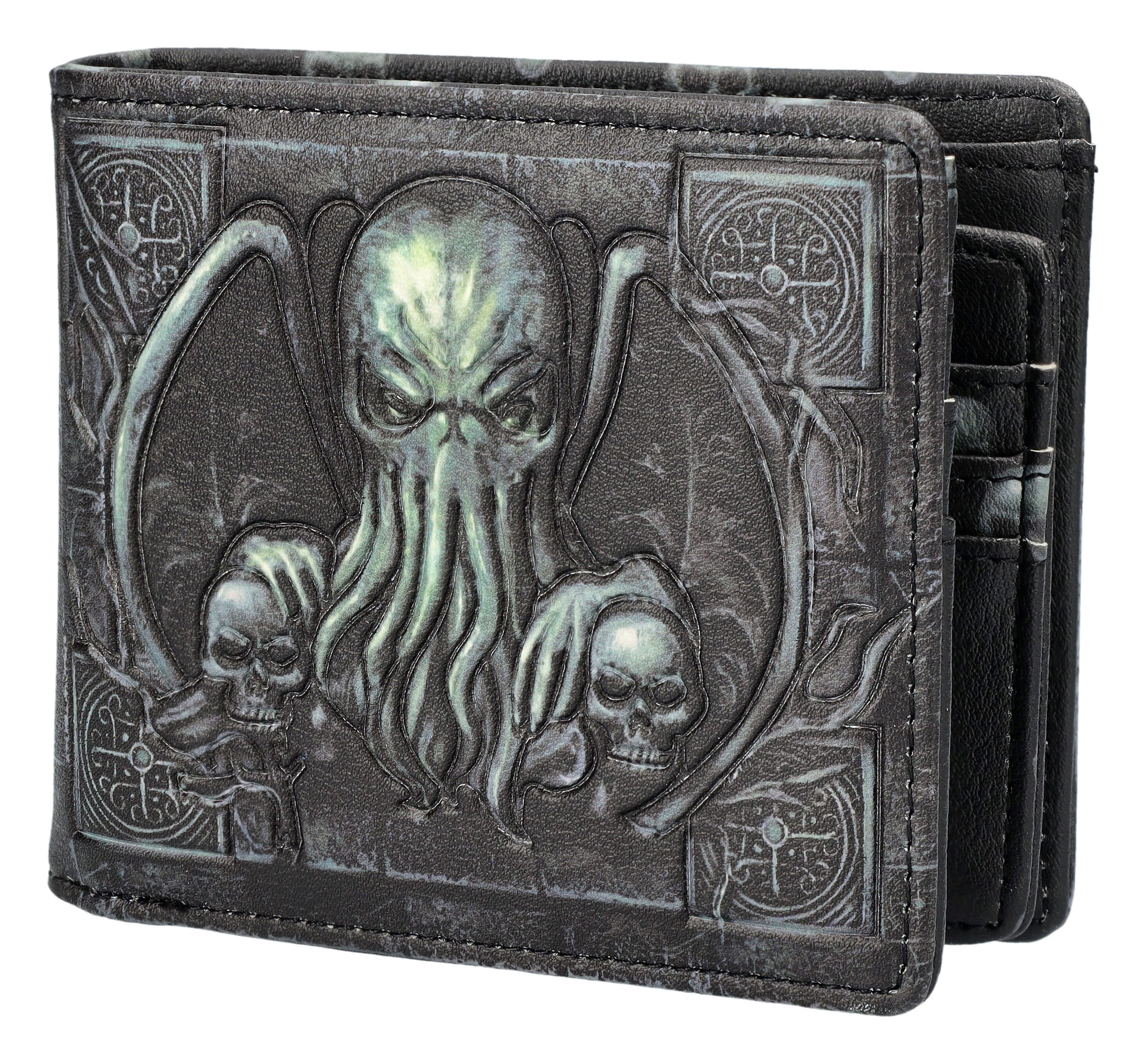 Dieser einzigartige Geldbeutel von Nemesis Now ist ein Muss für Fans düsterer Ästhetik und des Lovecraft-Universums. Das geprägte Kunstleder zeigt auf Vorder- und Rückseite das furchteinflößende Bild Cthulhus, der mit seinen Tentakeln zwei Totenschädel umschließt. Perfekt für Gothic-Fans, Fantasy-Liebhaber oder als stilvolles Geschenk.