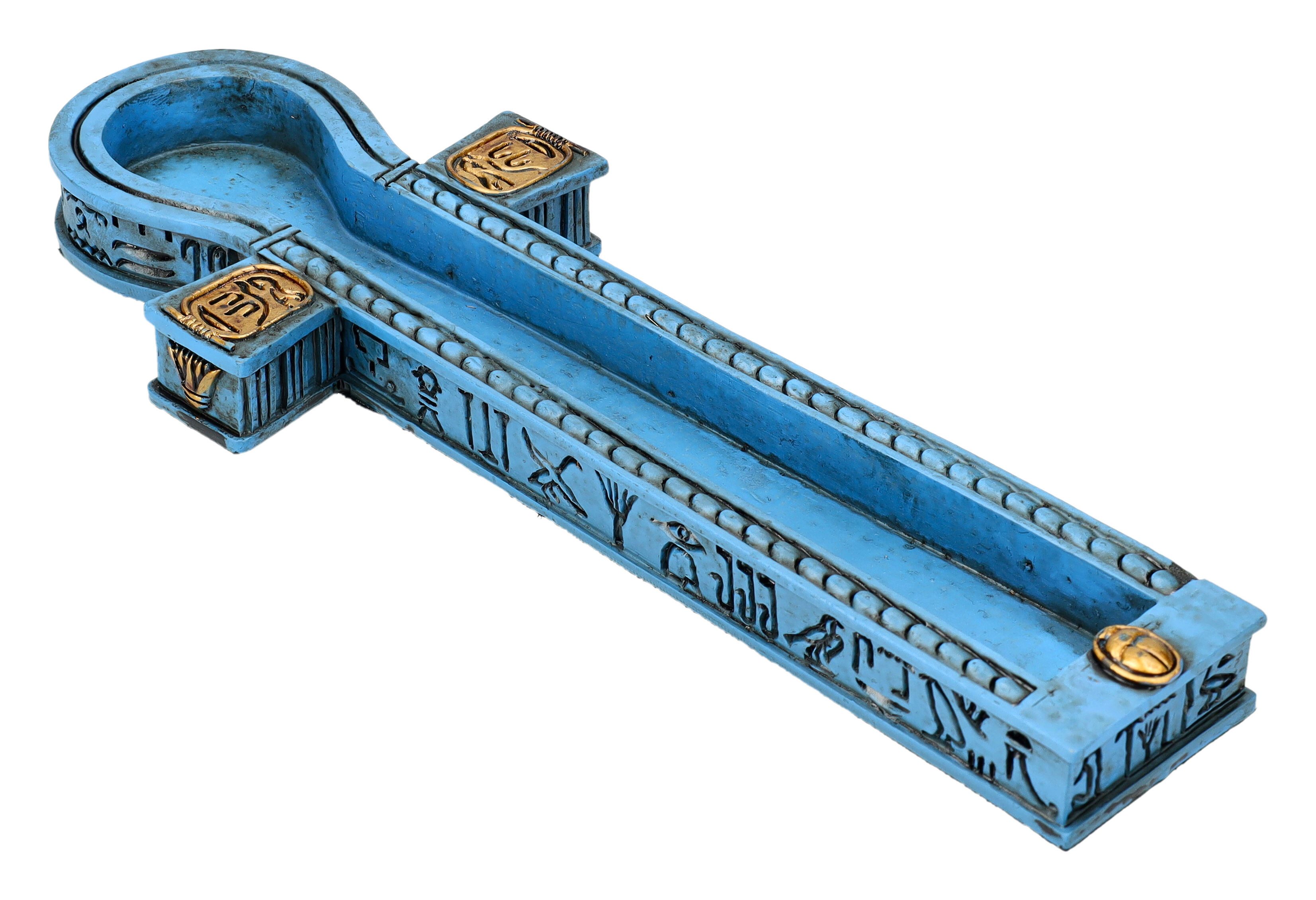 Wer sich für die faszinierende Geschichte des alten Ägyptens interessiert, wird sich über diesen schönen und stilvollen Räucherstäbchenhalter als Geschenk sicherlich sehr freuen. Das Ankh Kreuz stand im alten Ägypten für das Впередleben im Jenseits und wurde dem Pharao von Gott als Symbol des Lebens überreicht. Bei diesem 2 cm hohen, 23,5 cm breiten und 8,5 cm tiefen Räucherstäbchenhalter aus blau mit goldenen Akzenten handbemaltem Kunststein (Polyresin) bildet das Ankh Kreuz das Becken für das Räucherstäbchen. Ein wunderschöner Räucherstäbchenhalter für die stillen Momente der Entspannung. Die Lieferung erfolgt ohne Räucherstäbchen, die Sie jedoch in großer Auswahl und in zahlreichen Duftrichtungen in unserem Shop finden können.