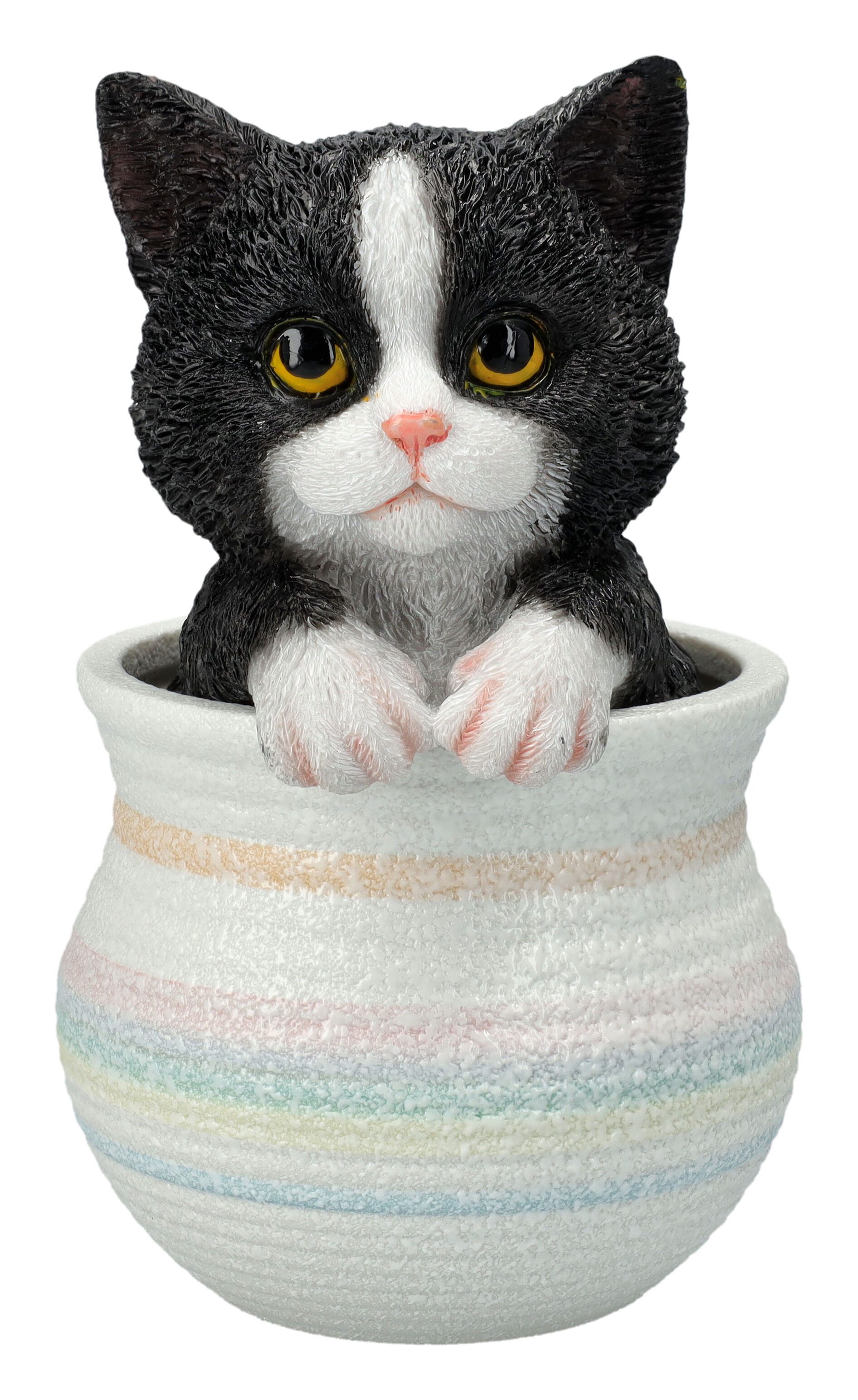 Dieses niedliche Kätzchen hat das perfekte Versteck gewählt – einen kleinen Blumentopf! Mit großen Augen und detailliertem Fell schaut die liebevoll handbemalte Katzenfigur aus Kunststein (Polyresin) hervor. Die 15,5 cm hohe, 8,5 cm breite und 8,5 cm tiefe Dekofigur ist ein echter Blickfang und eine tolle Geschenkidee für Katzenliebhaber.