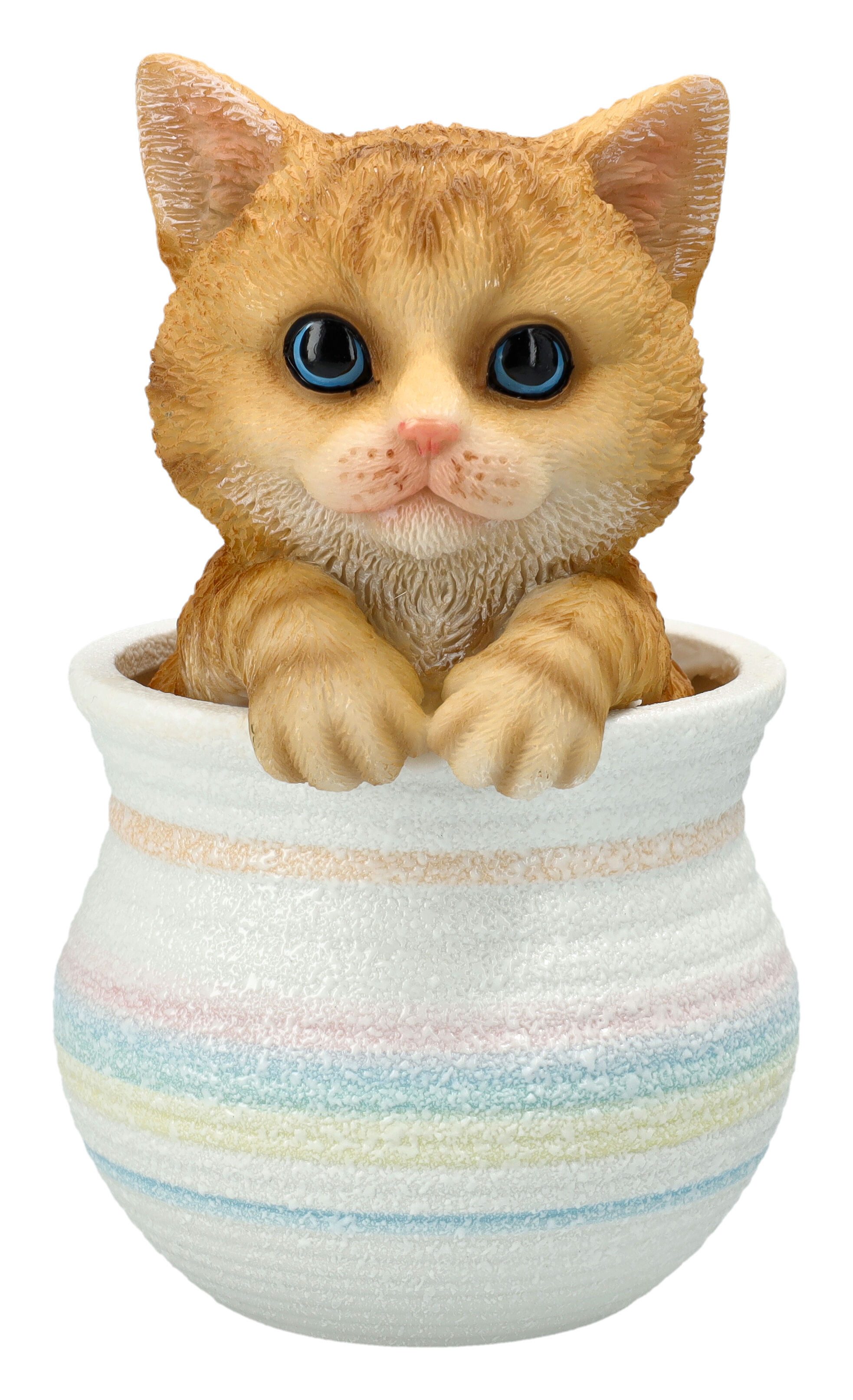 Gefertigt aus hochwertigem Kunststein (Polyresin) und von Hand bemalt, besticht die Figur durch ihre lebensechte Gestaltung. Die großen Augen, das fein gezeichnete Fell und die niedlichen Pfoten, die über den Blumentopfrand greifen, verleihen ihr eine besonders charmante Ausstrahlung.