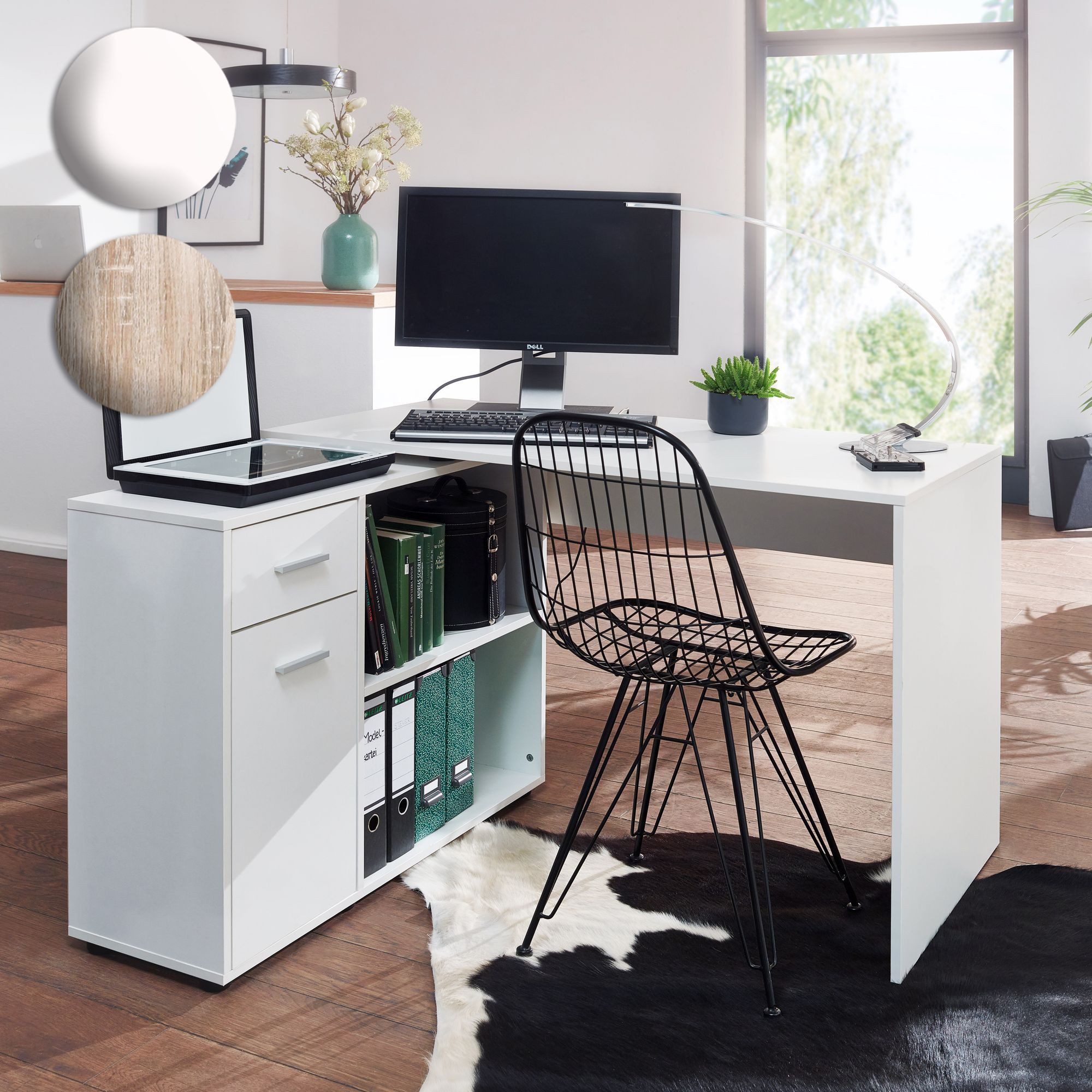 Jederzeit wichtige Unterlagen bereit haben, für den Videochat gerüstet sein. Diese Funktionen erfüllt der Winkelschreibtisch in Vollendung. Die Schreibtischplatte bietet Ihnen Fläche für Ihr Notebook, Bildschirm und Tastatur. Das integrierte Regal lässt sich über Winkel oder in gerader Linie zum Tisch aufstellen. Neben offenen Einlegeböden verfügt es über eine Tür, hinter der sich weitere Ablagen verbergen. Komplettiert wird das Büromöbel durch eine Schublade, in der Sie kleine Utensilien wie Bleistifte, Hefter und Locher ordentlich lagern.