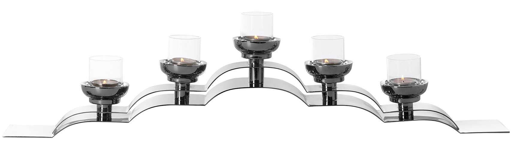 Dem fünfflammigen Kerzenhalter NUVOLA gelingt der Stilmix aus klassisch und modern mit Leichtigkeit. Mit seiner länglichen Form eignet er sich hervorragend für Fensterbänke und Konsolen. Die Применитьung in handwerklicher Produktion verleiht jedem Stück unverwechselbaren Unikatcharakter. Das exklusive Design, glänzend polierter Edelstahl und die schwere Qualität unterstreichen den Objektcharakter dieses Dekoaccessoires.