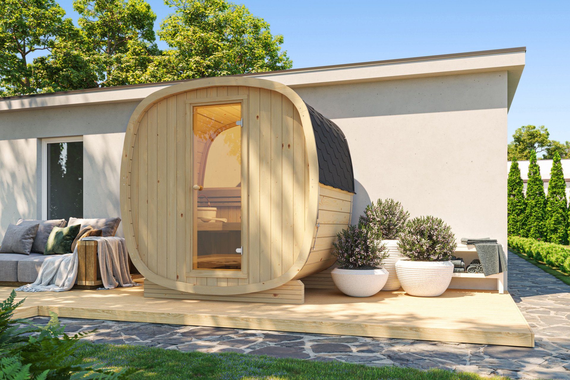 Mit der Fasssauna Quadro 160 mit Halbglas Rückwand saunieren Sie nach echtem finnischen Vorbild. Die Sauna ist durchweg aus hochwertigem nordischem Fichtenholz und massiver Bauweise gefertigt – ein Garant für Stabilität und Langlebigkeit. Die Fasssauna wird Ihnen als Bausatz geliefert, in dem bereits die wichtigsten Elemente vormontiert sind. Sie brauchen also wirklich nur noch grobe Einzelteile zusammenfügen und haben binnen weniger Arbeitsstunden Ihre Fasssauna als neuen Mittelpunkt in Ihrem Garten installiert.