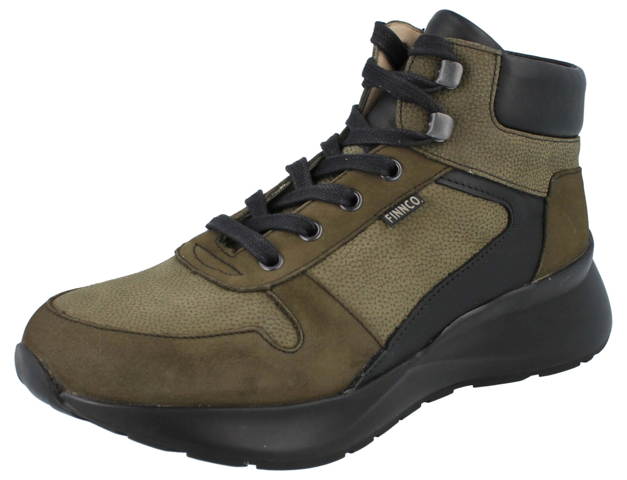 In den Farben Oliv und Schwarz mit einem dunklen Sohlenrand und schwarzen Schnürsenkeln präsentiert sich das neue FinnComfort Modell Meribel.
