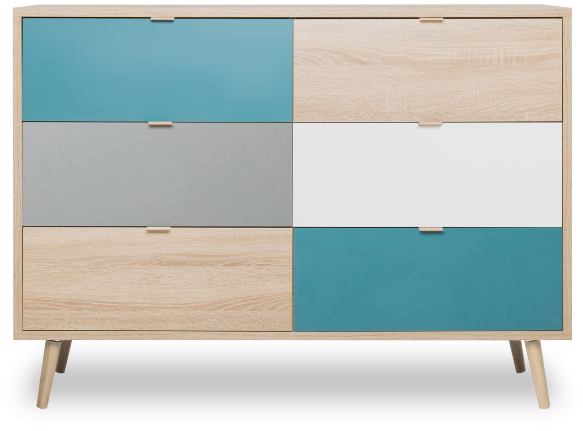 Die Kommode aus der skandinavischen Serie bietet sechs geräumige Schubkästen und überzeugt durch ihre stilvolle Farbgestaltung in Sonoma Eiche, Weiß, Grau und Petrol. Sie steht auf konischen Vollholzfüßen (ca. 16 cm hoch) und ist mit Kunststoffgriffen in Sonoma Eiche Optik ausgestattet. Melaminbeschichtung und ABS-Kanten sorgen für Langlebigkeit und pflegeleichte Oberflächen. So vereint sie praktischen Stauraum mit zeitlosem skandinavischem Design.
