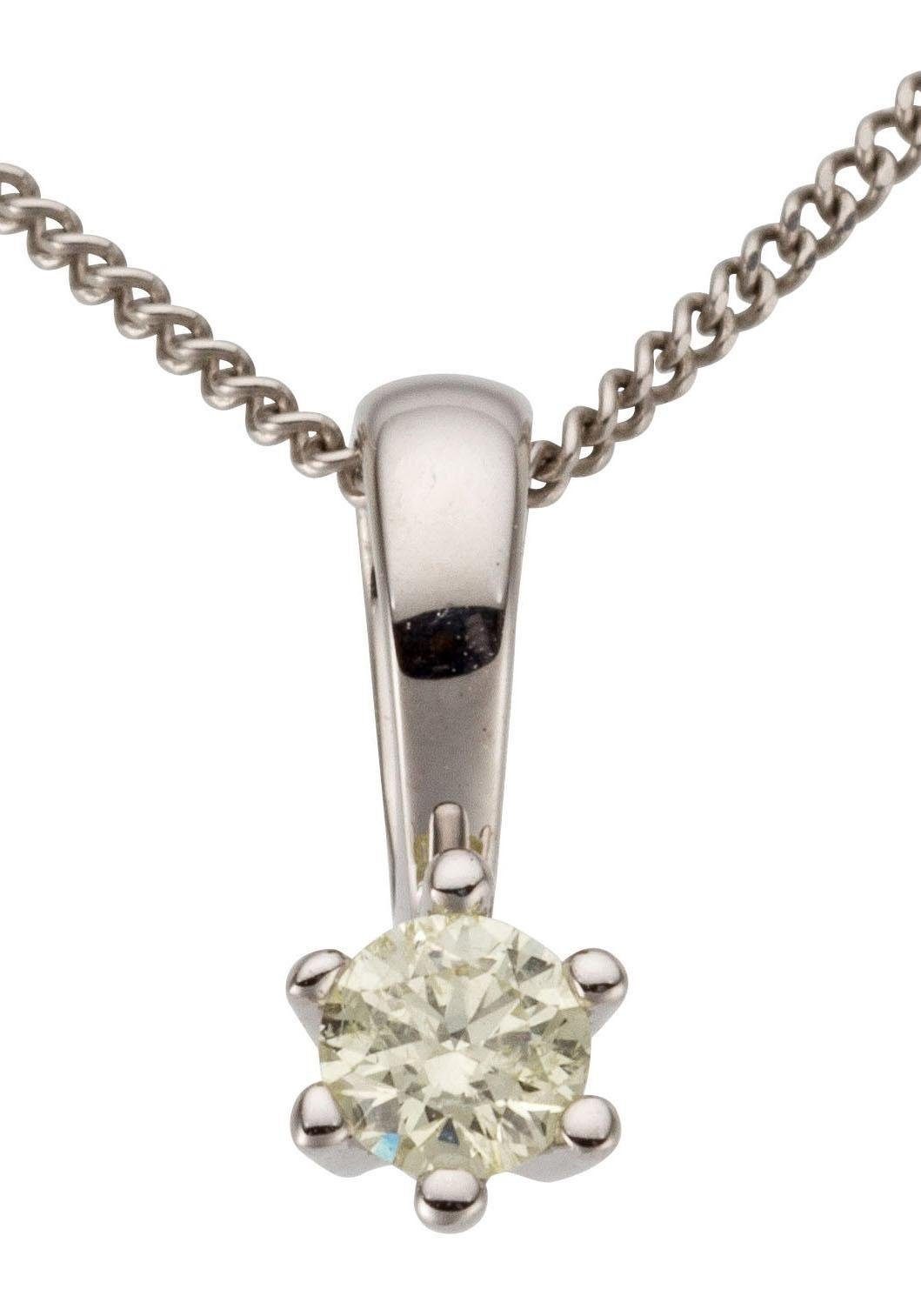 Erleben Sie die facettenreiche Welt der Diamanten. Schlicht, feminin und gleichzeitig hinreißend schön ist dieser tolle Anhänger. Das Schmuckstück begeistert mit seiner filigranen Gestaltung, durch die der zauberhaft funkelnde Brillant noch eindrucksvoller zur Geltung kommt. Luxuriöser Schmuck hat es nicht nötig, aufdringlich zur Schau gestellt zu werden und deswegen ist dieser sehr stilvolle Solitär-Anhänger eine erstklassige Wahl, um bei allen Anlässen einen geschmackvollen Auftritt hinzulegen.