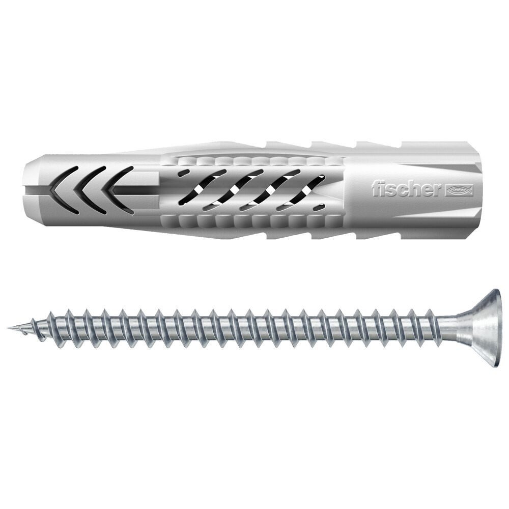 Der Fischer Universaldübel UX ist der Allrounder aus hochwertigem Nylon. Der Dübel hält in Beton, aber auch in Porenbeton, im Mauerwerk und in Gipskarton- und Gipsfaserplatten. In diesen Baustoffen verknotet der Dübel. Praktisch ist der angeformte Rand. Damit rutscht der Dübel beim Einstecken nicht ins Bohrloch. In der Verpackung sind bereits die passenden Schrauben zum Dübel dabei. Mit dem Fischer Universaldübel UX mit Rundhaken können zum Beispiel Leuchten und abgehängten Gegenständen befestigt werden.
