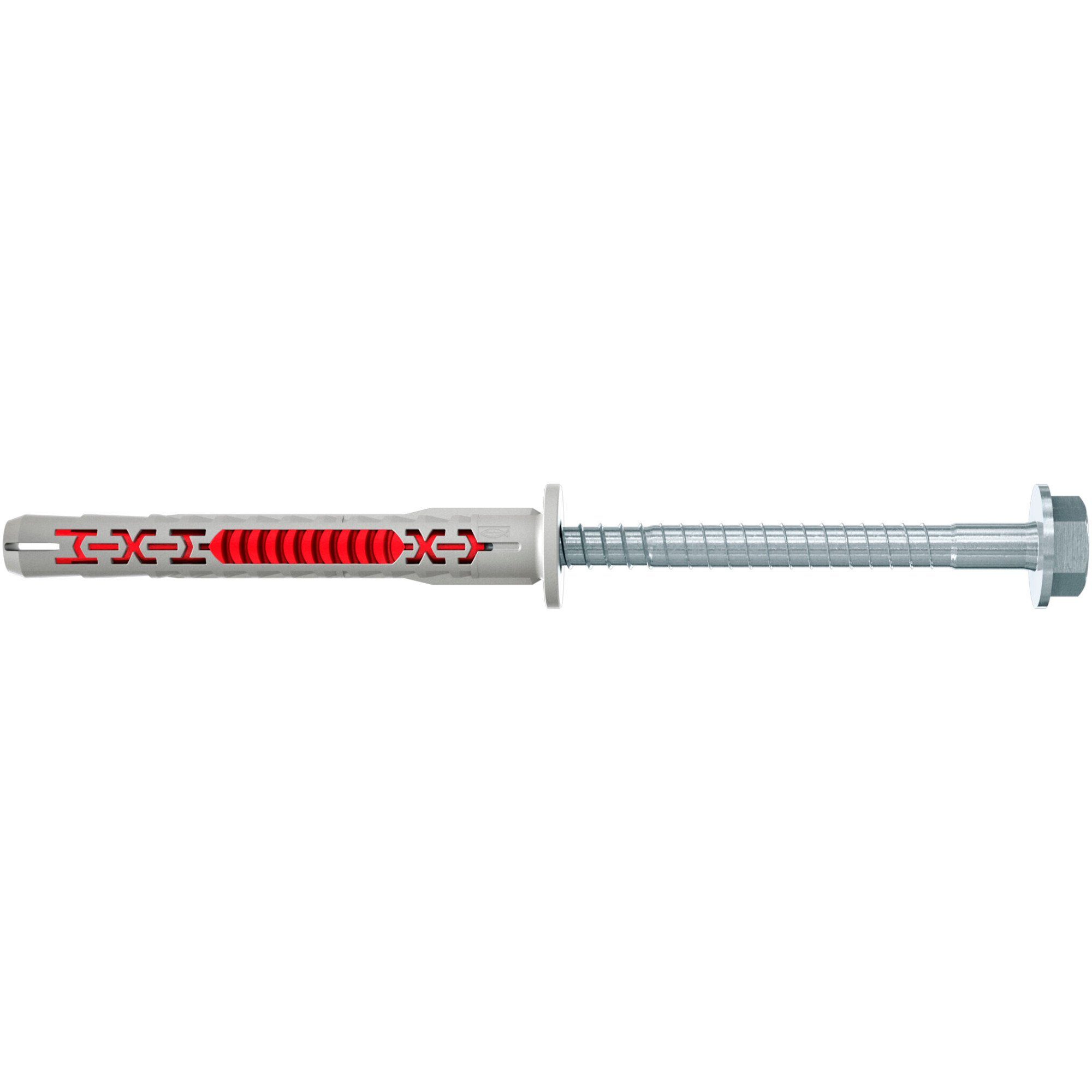 50 Stück Der fischer Langschaftdübel DuoXpand 8x80 FUS mit spezieller Lamellengeometrie verspreizt sich materialschonend im Baustoff und vermeidet so Brüche in porösen Baustoffen. Damit sind auch randnahe Verankerungen problemlos möglich. Der graue Grundkörper aus hochwertigem Nylon bietet starken Halt, während die flexible, rote Materialkomponente für optimales Aufspreizen sorgt. Der DuoXpand eignet sich für die Durchsteckmontage. In Vollbaustoffen bietet das abgestimmte Produktdesign eine gleichmäßige Lastverteilung in den Untergrund, und im Lochsteinmauerwerk spreizen die Lamellen am Steinsteg und bilden im Hohlraum einen Hinterschnitt aus. Die Варианты mit galvanisch verzinkter Sechskantschraube mit angeformter Unterlegscheibe eignet sich besonders gut zur Befestigung von Metallkonstruktionen, Kabelkonsolen, Carports, Alu-Vordächern, TV-Halterungen oder Fensterrahmen. Die bereits vormontierte Sicherheitsschraube ist perfekt auf den Langschaftdübel DuoXpand 8x80 FUS abgestimmt und spart Zeit bei der Montage.