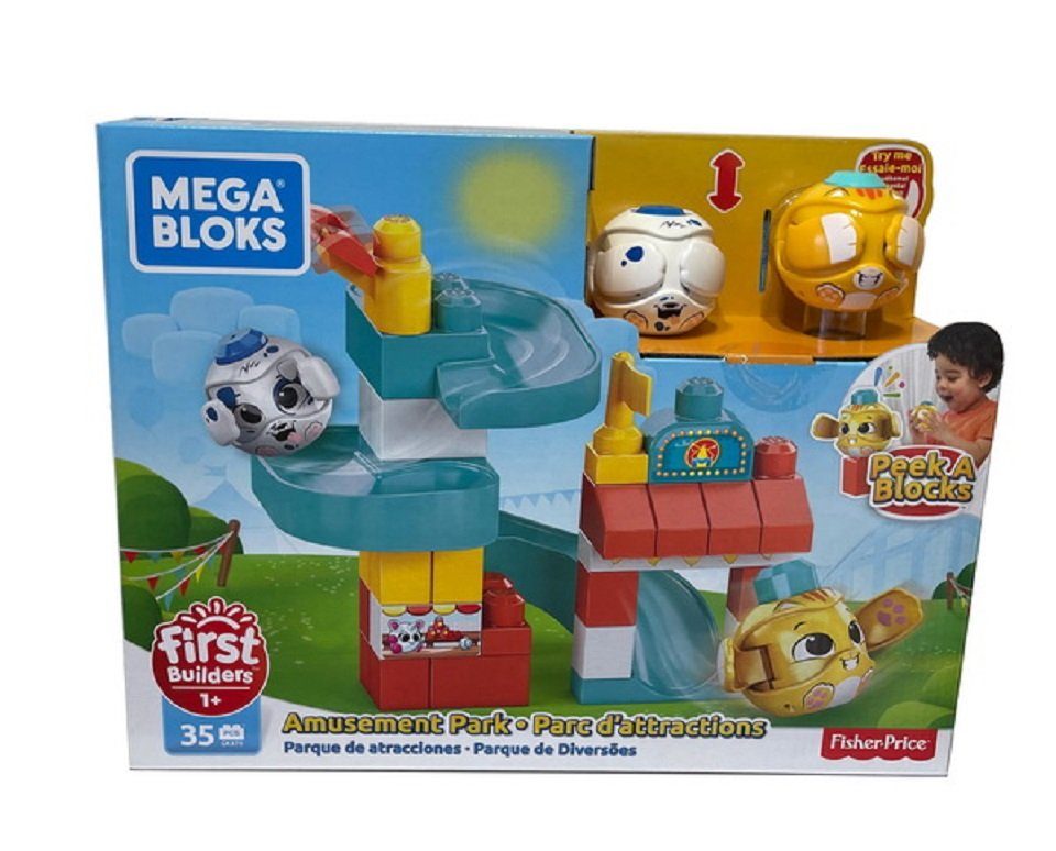 Das Mega Bloks Vergnügungspark hilft den kleineren Kindern, ihre ersten Motorikfähigkeiten zu trainieren.