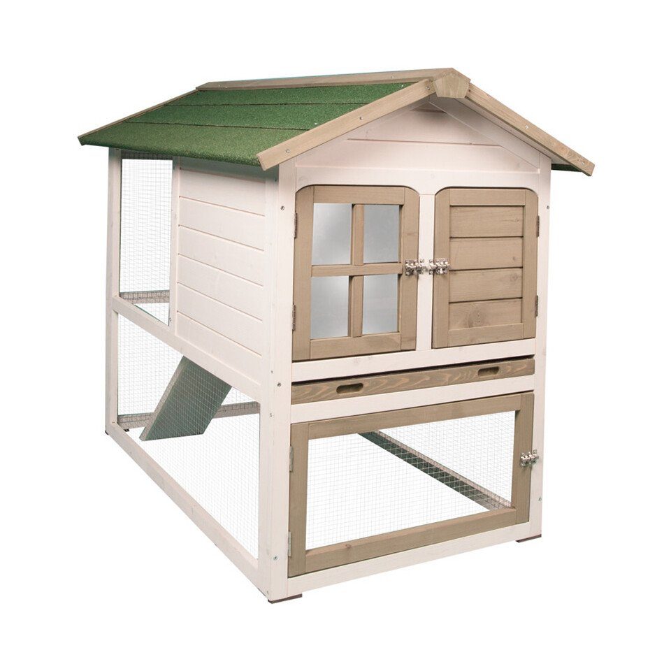 Der Condo-Hühnerstall hat einen großen Nachtunterstand und einen teilweise überdachten Auslauf. Der Auslauf kann zum Reinigen oder bei schlechtem Wetter geschlossen werden. Unter dem Nachtlager befindet sich eine ausziehbare Kunststoffschublade, damit Sie das Nachtlager auch richtig reinigen können. Sowohl der Auslauf als auch der Nachtunterstand sind zugänglich und können mit Schiebern verschlossen werden. Der Stall steht auf Gummifüßen, so dass er fest steht und nicht so leicht verrutschen kann.