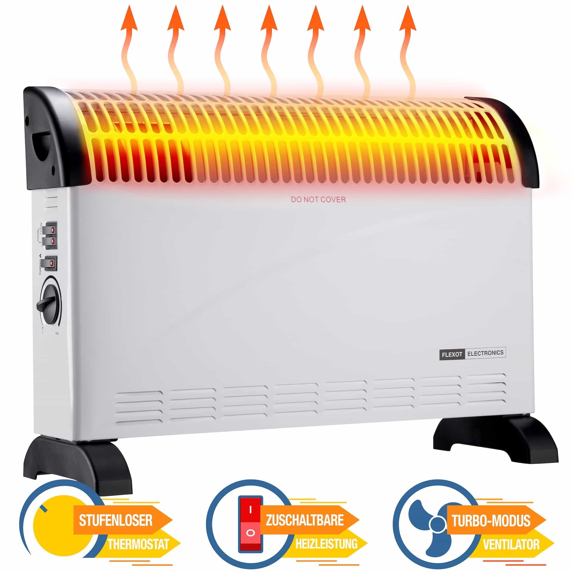 Top-Features | Elektroheizung, 2.000 W mit Turbo Funktion, stufenlos regulierbar, Frostschutz, geräuschlos, sicher, Überhitzungsschutz, Automatik, Thermostat stufenlos |