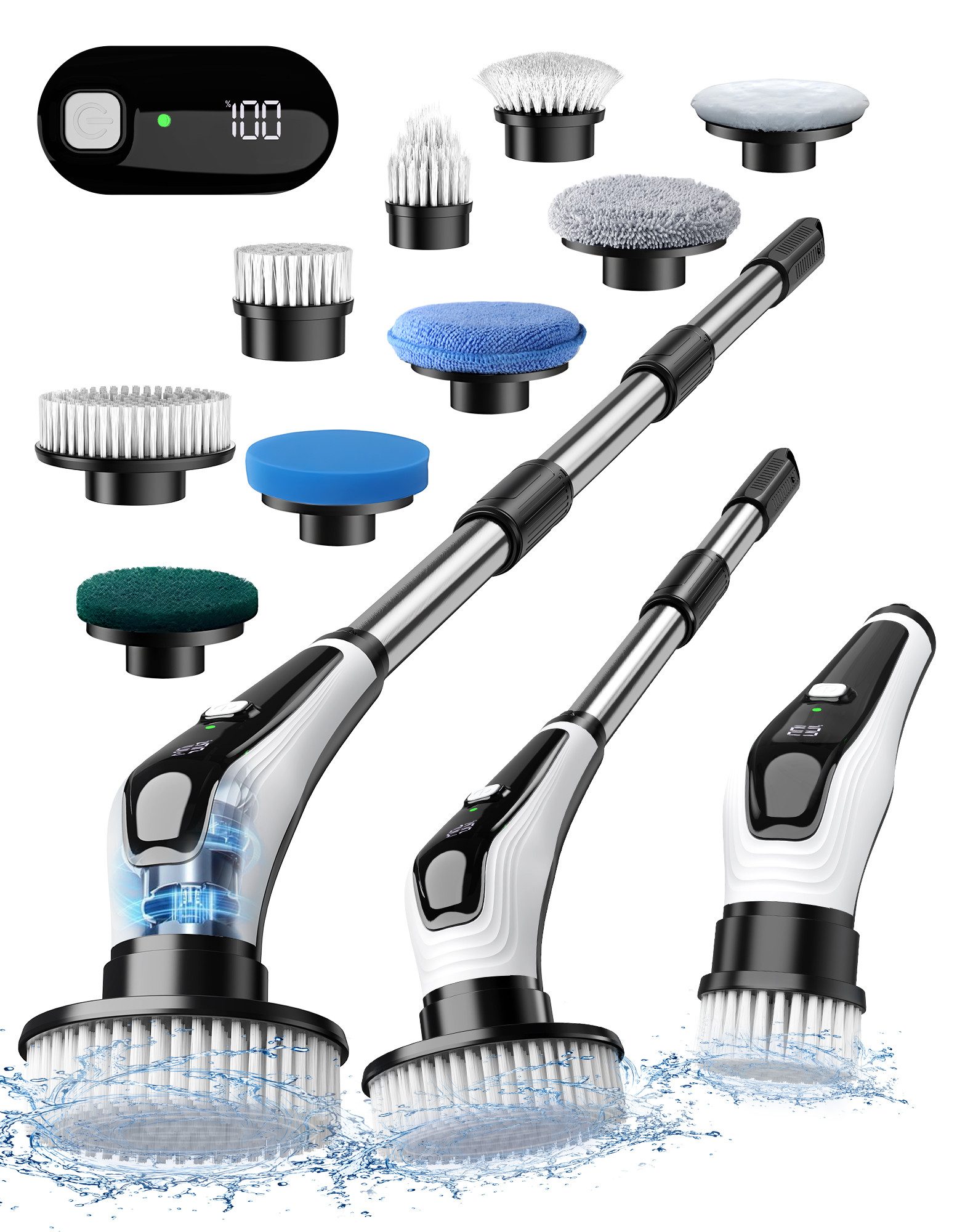 Die elektrische Reinigungsbürste verfügt über einen ergonomischen Griff mit drei verstellbaren Длинаn (30 cm, 84 cm, 107 cm), ideal für alle Reinigungswinkel in Ihrem Zuhause. Hergestellt aus einer verstärkten Aluminiumlegierung ist der Teleskopstab bruchfest und langlebig. Zudem bieten wir eine 2-jährige kostenlose Garantie, damit Sie unser Produkt sorgenfrei nutzen können. Die Borsten halten einer Zugkraft von über 2,5 kg stand und garantieren eine hohe Haltbarkeit.