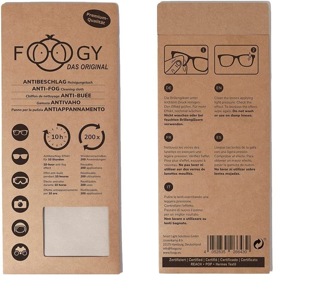 Foogy Antibeschlag Brille - Mikrofaser Reinigungstuch Das FOOGY Mikrofasertuch ist ein Antibeschlagstuch, welches für Brillen jeglicher Art geeignet ist. In Zeiten von Corona ist es ideal, da es beim Tragen einer Mund-Nase-Maske das Beschlagen der Brille verhindert. Es ist ein absolut trockenes Mikrofasertuch, auf Basis neuester „superhydrophiler Nanotechnologie“. verhindert das Beschlagen von Brillengläsern verhindert das Beschlagen von Brillengläsern Effekt bis zu 10 Stunden Antistatisch, streifenfrei, fusselfrei funktioniert auch bei Kameralinsen, Helmvisieren, Ferngläsern und vielen weiteren Produkten Anwendung: 1. Sollten die Gläser nass/feucht sein, diese zunächst mit einem haushaltsüblichen Tuch trocknen 2. Normaler Schmutz oder Staub kann auch mit dem FOOGY Tuch entfernt werden 3. Nehmen Sie das FOOGY Tuch und reinigen Sie die Gläser mit leichtem Druck 4. Überprüfen Sie den Antibeschlageffekt (z.B. beim Halten der Brille über kochendes Wasser oder durch Anhauchen der Gläser) Technische Details: Farbe: grau Material: Mikrofaser Größe: Einzelpack, 1 Tuch Lieferumfang: 1x FOOGY Antibeschlagtuch (Einzelpack - Inhalt 1 Tuch)