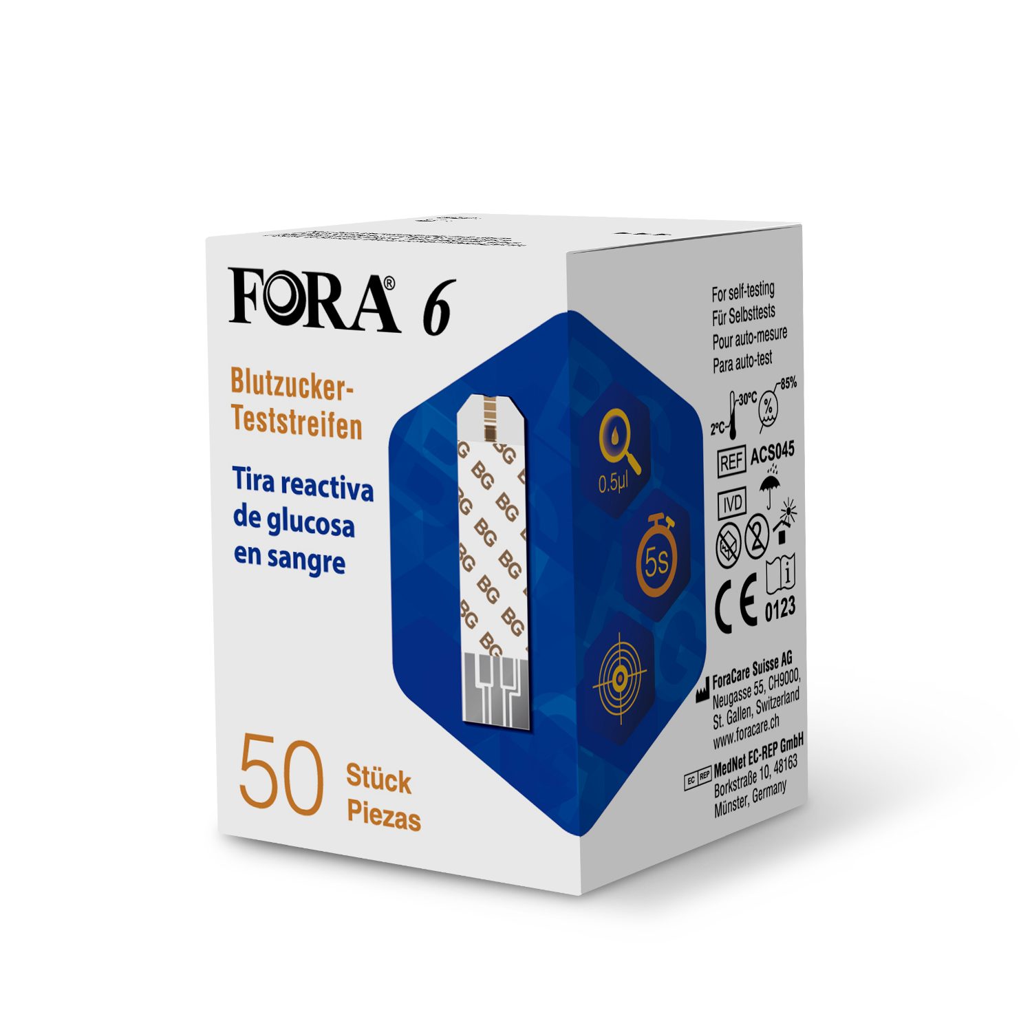 REF ACS054 Benötigt zur Messung eines der folgenden Geräte: FORA 6 Connect – Multifunktions-Messsystem FORA 6 Plus FORA 6 Duo Mit den FORA 6 Blutzucker-Teststreifen kann in Verbindung mit einem Messgerät der FORA® 6-Reihe der Blutzuckerspiegel von Patienten selbständig im eigenen Heim oder durch medizinisches Fachpersonal gemessen werden. Es werden frische Vollblutproben aus der Fingerbeere sowie von folgenden alternativen Entnahmestellen verwendet: Handballen, Oberarm und Unterarm. Dieses System ist nicht zur Diagnose von Diabetes mellitus oder für Tests auf Diabetes mellitus geeignet. Packungsinhalt Sicherheitsverpackung mit 50 Teststreifen (nur für den einmaligen Gebrauch) ohne Lanzetten