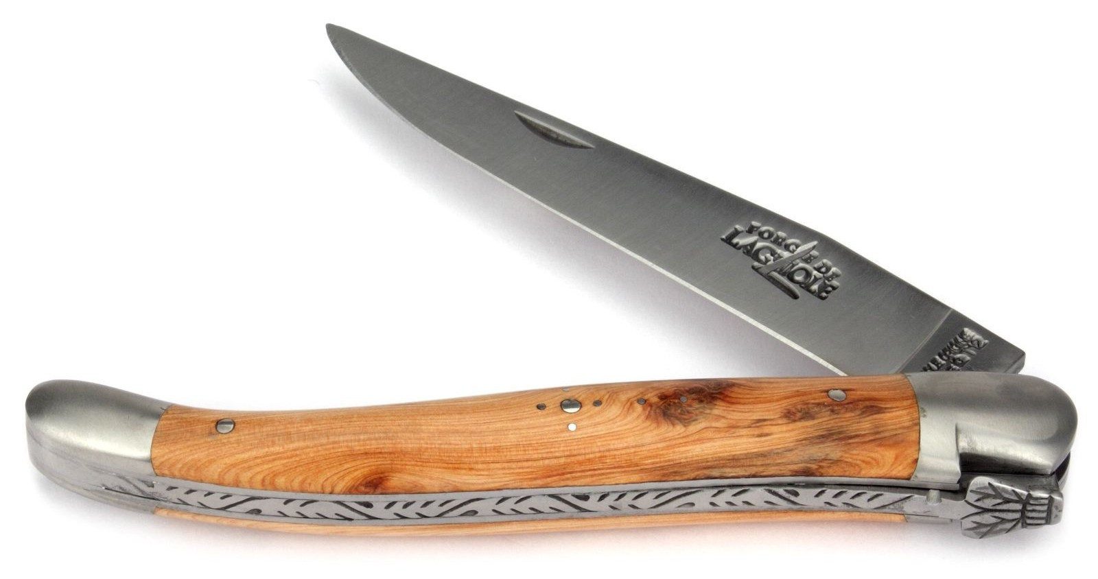 An der Klingenwurzel ist entweder der Schriftzug "LAGUIOLE ORIGINE GARANTIE LOG" oder seit Ende 2019 der Schriftzug "FABRIQUE A LAGUIOLE FRANCE" zusammen mit der Stahlsorte eingeprägt.