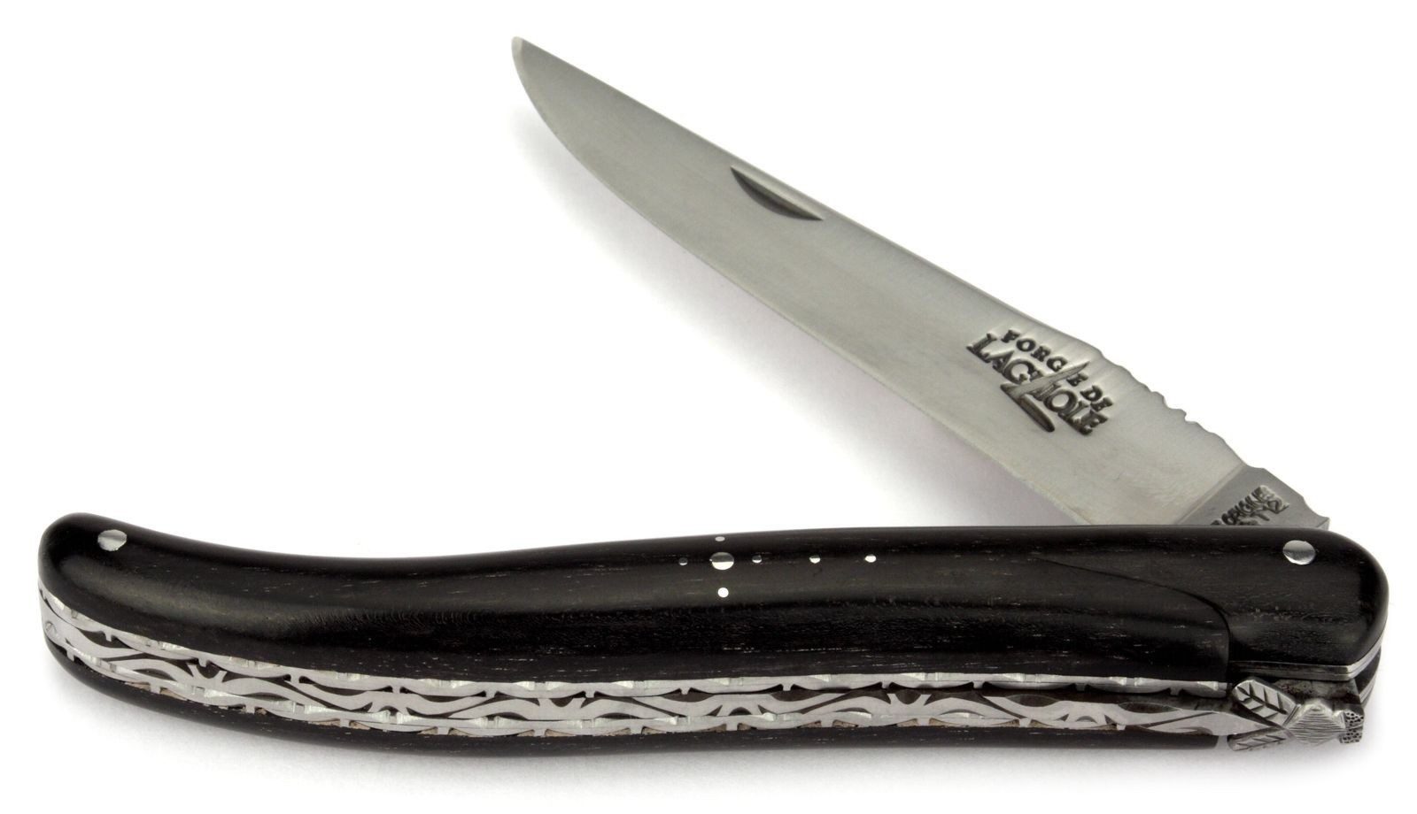 Die vollen Griffschalen des Taschenmessers sind aus dunklem Ebenholz gefertigt.