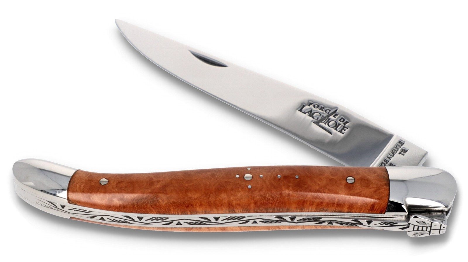 An der Klingenwurzel ist entweder der Schriftzug "LAGUIOLE ORIGINE GARANTIE LOG" oder seit Ende 2019 der Schriftzug "FABRIQUE A LAGUIOLE FRANCE" zusammen mit der Stahlsorte eingeprägt. Feder und Biene sind aus einem Stück geschmiedet.