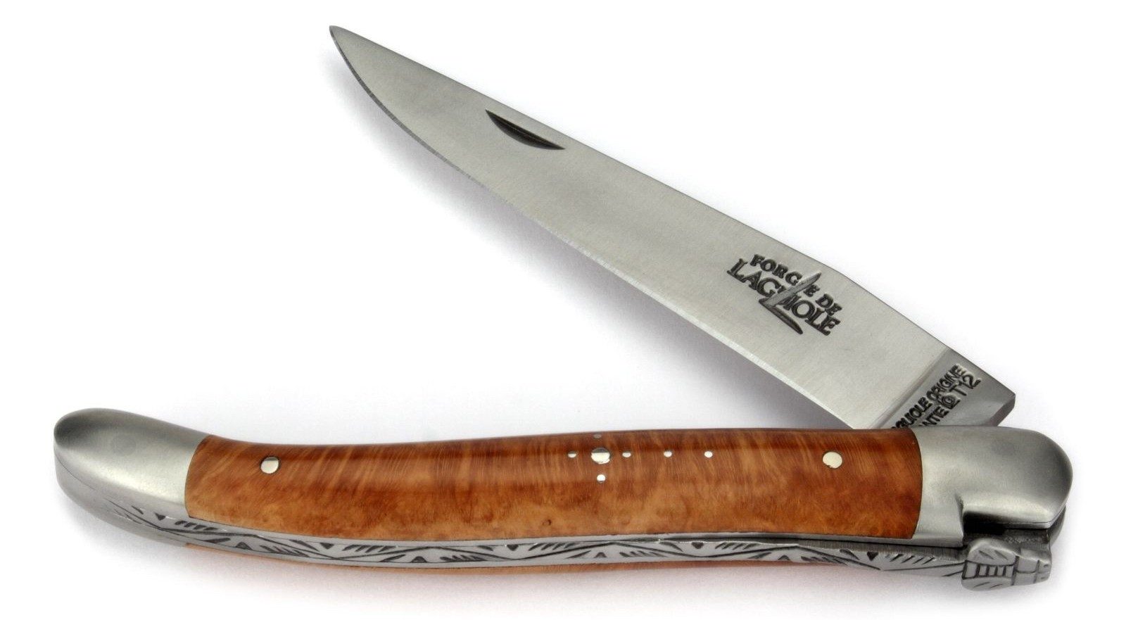 An der Klingenwurzel ist entweder der Schriftzug "LAGUIOLE ORIGINE GARANTIE LOG" oder seit Ende 2019 der Schriftzug "FABRIQUE A LAGUIOLE FRANCE" zusammen mit der Stahlsorte eingeprägt.