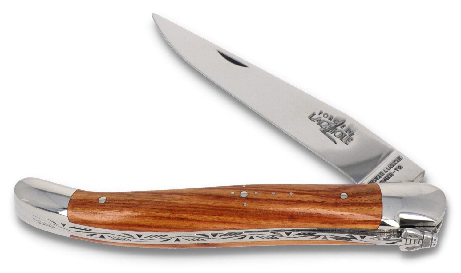 Die glänzend polierte Holzoberfläche harmoniert wunderbar mit den ebenfalls glänzend ausgeführten Metallteilen dieses Laguiole Taschenmessers.
