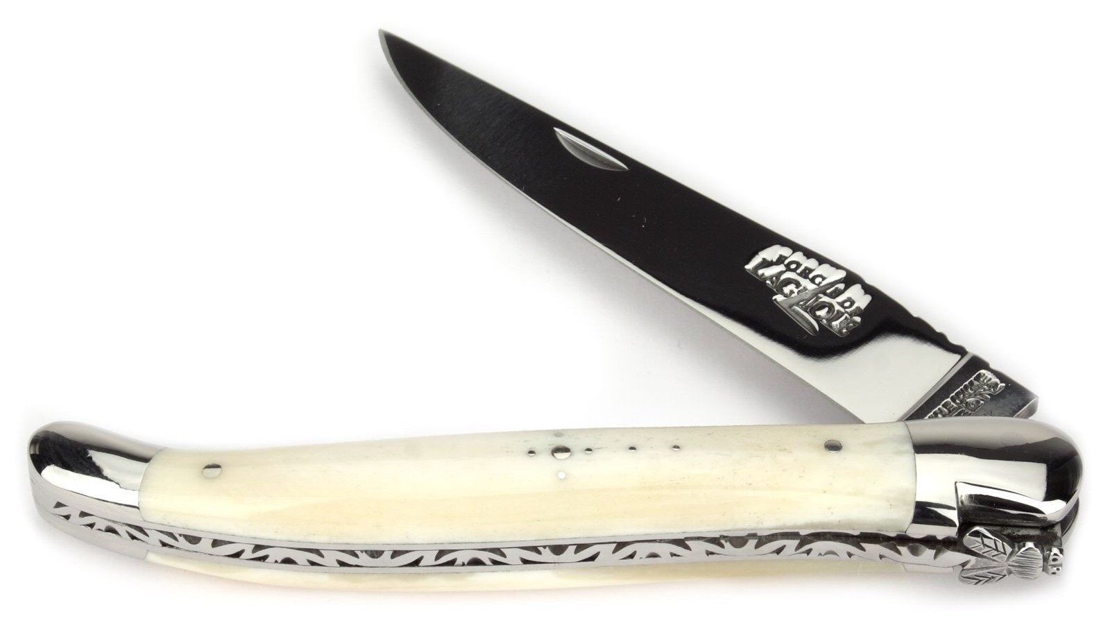An der Klingenwurzel ist entweder der Schriftzug "LAGUIOLE ORIGINE GARANTIE LOG" oder seit Ende 2019 der Schriftzug "FABRIQUE A LAGUIOLE FRANCE" zusammen mit der Stahlsorte eingeprägt.