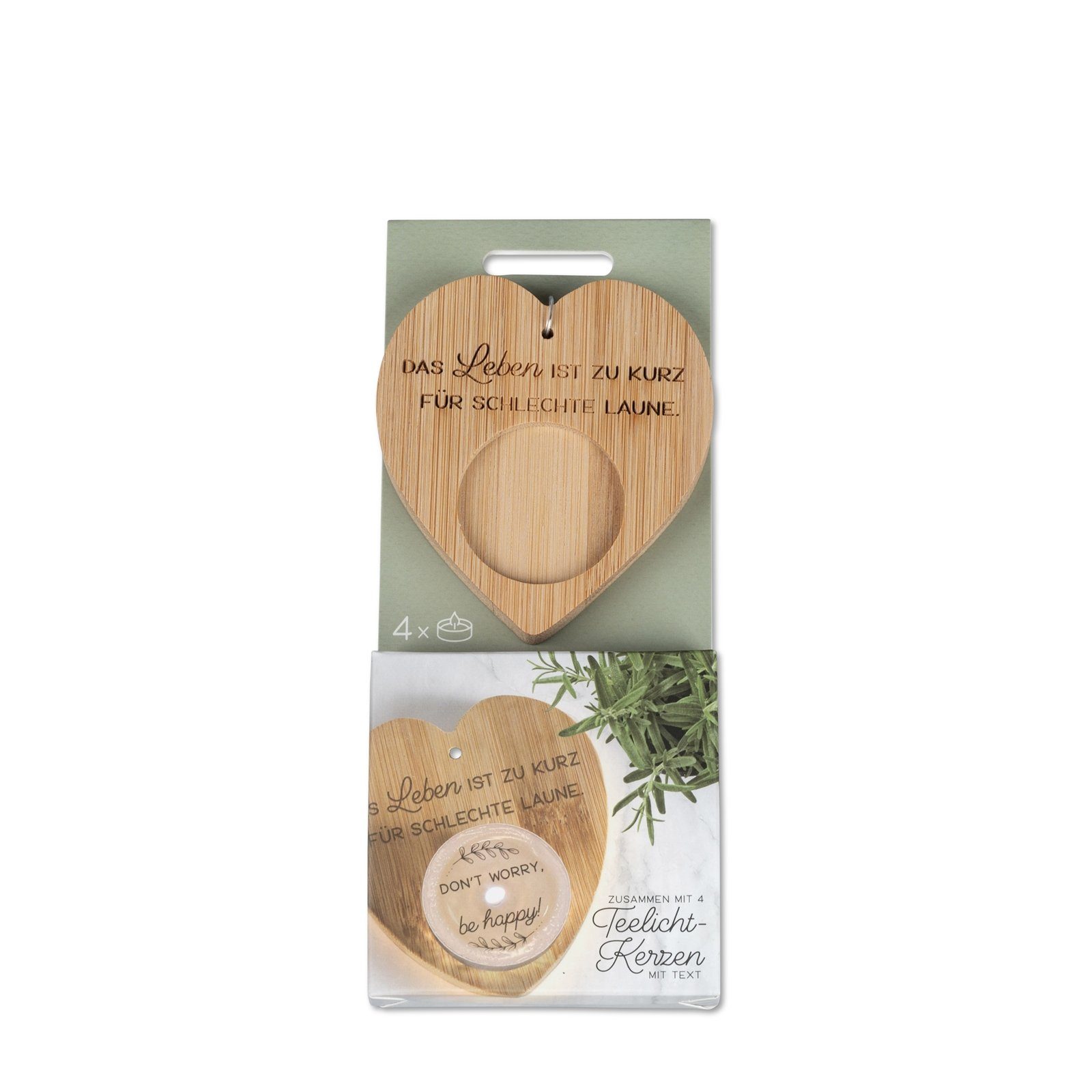 Maße: Herz Ø/H 8 x 1 cm, Material: Herz ist aus Bambusholz gefertigt, Lieferumfang: 1 Teelichthalter und 4 Teelichter mit Überraschungsspruch