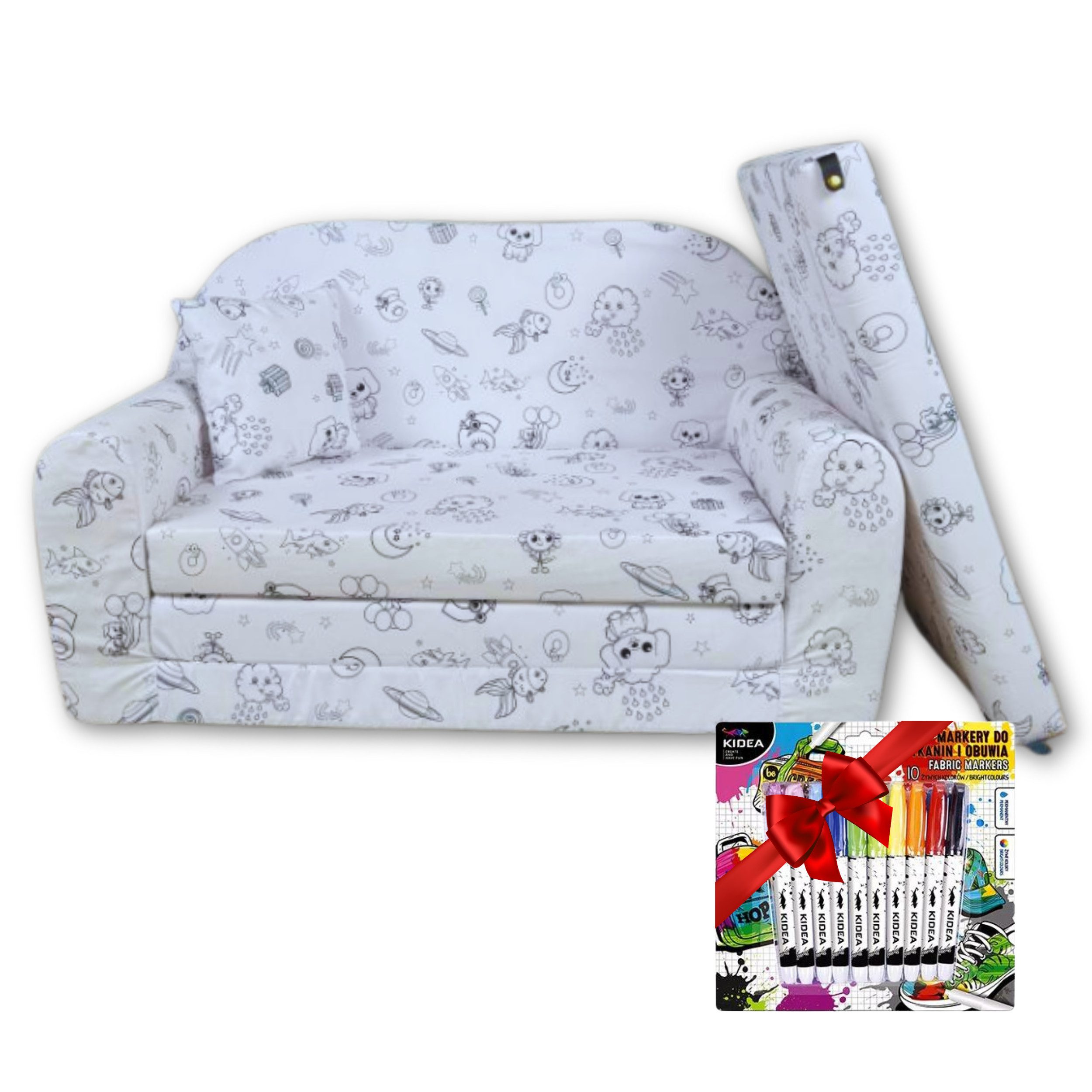 Das Kinder-Sofa "Malspaß" ist mehr als nur ein Möbelstück – es ist ein Ort für Entspannung, Spiel und grenzenlose Fantasie. Es bietet nicht nur höchsten Komfort, sondern inspiriert Kinder dazu, ihre Kreativität zu entfalten, indem sie das Sofa ganz nach ihren eigenen Vorstellungen gestalten können. Das ausklappbare Kinder-Sofa "Malspaß" ist eine absolute Neuheit auf dem Markt und verbindet erstmals kreatives Gestalten mit multifunktionalem Komfort – ein einzigartiges Möbelstück, das Kinder begeistert!