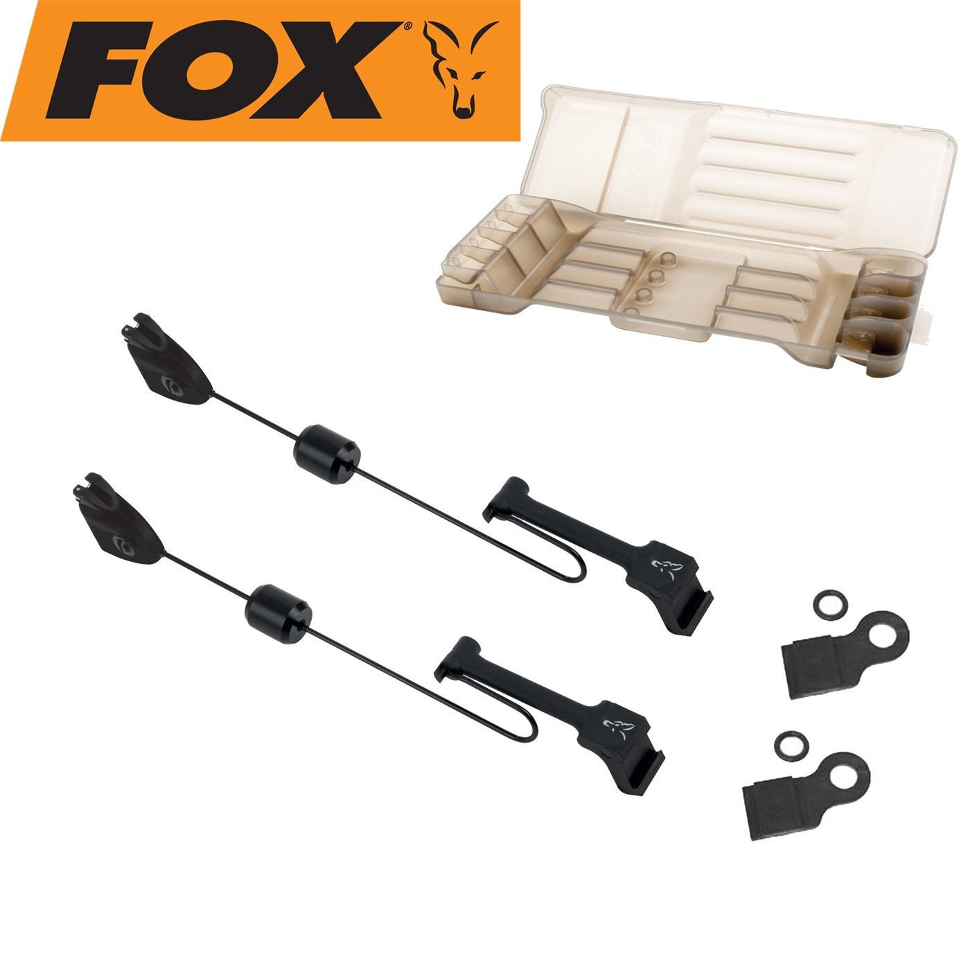 Lieferumfang: Fox MK3 Swinger Set bestend aus 2 Bissanzeigern + Transportbox + Adapter zum Befestigen