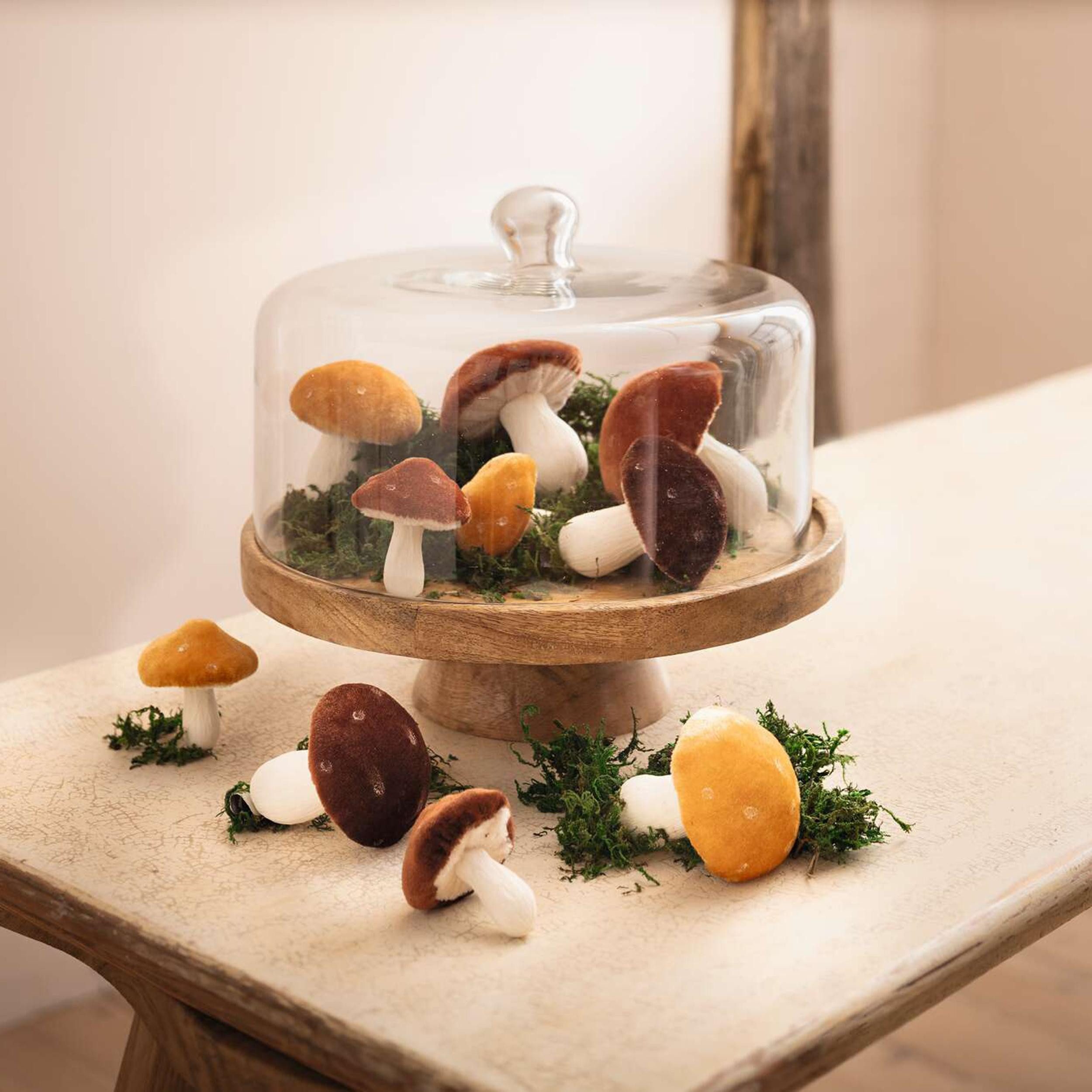 Setzen Sie Ihre Speisen oder Dekorationen stilvoll in Szene mit der Servierplatte "Rund". Diese elegante Kombination aus naturbelassenem Mangoholz und einer klaren Glasglocke überzeugt mit zeitloser Schönheit und hochwertiger Verarbeitung.