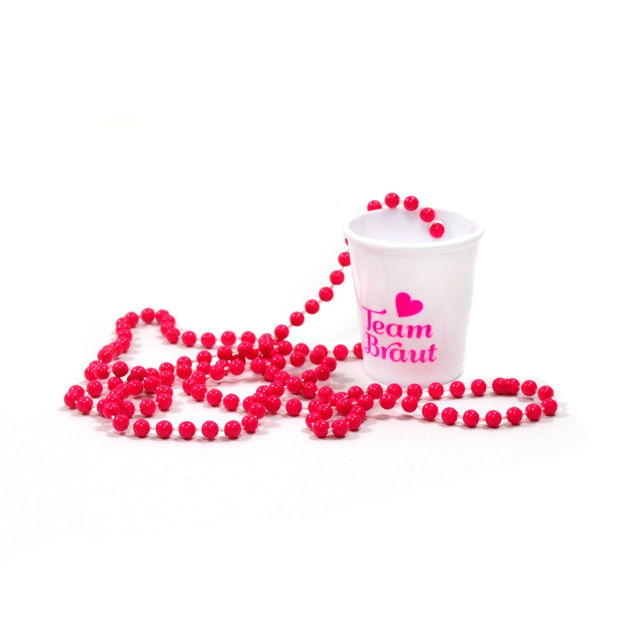 Wiederverwendbare JGA Schnaps Pinnchen mit stabiler Perlenkette zum Umhaengen. Ideal fuer Unterwegs