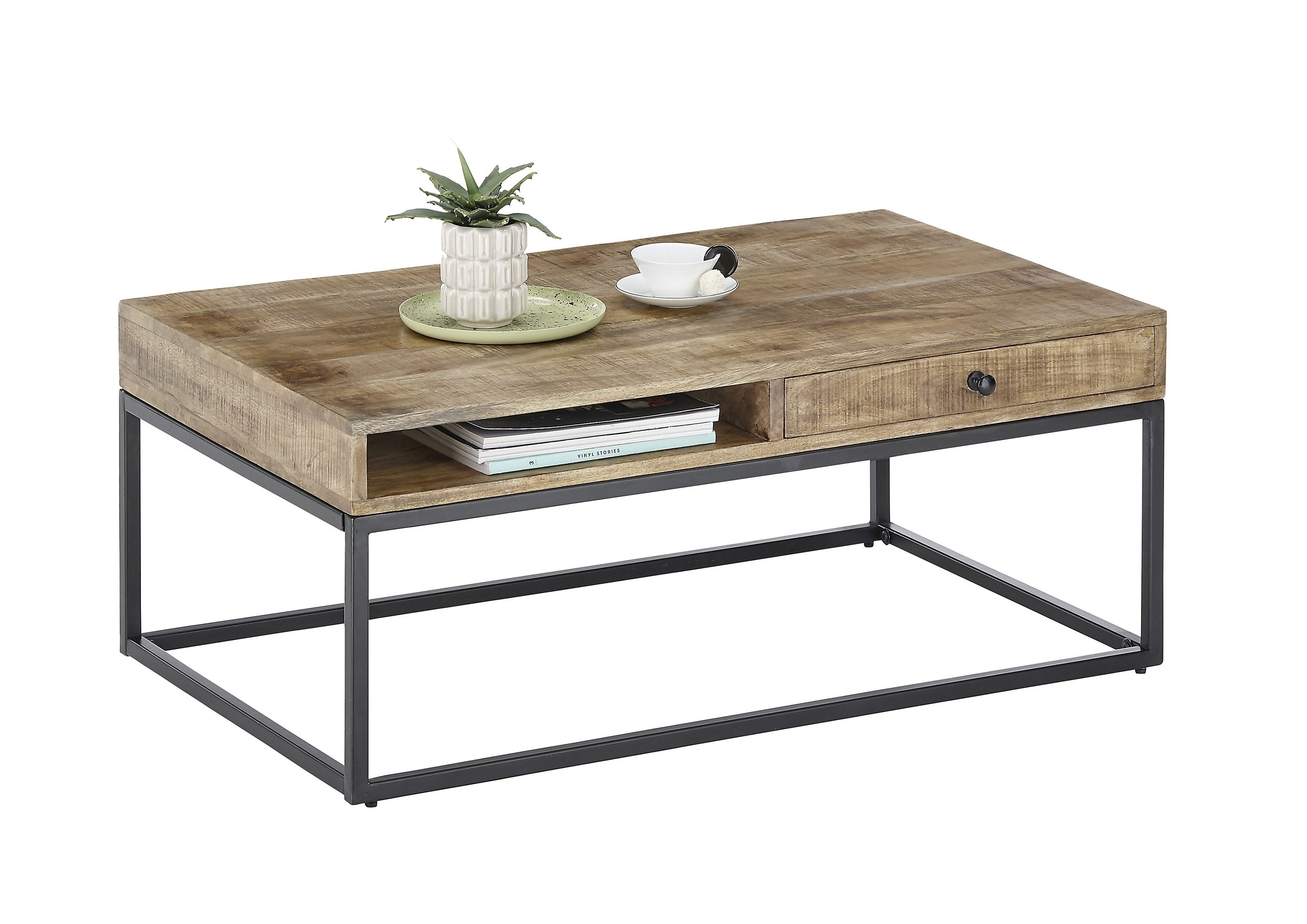 Entdecken Sie den Couchtisch Alison: Zeitlose Eleganz in massivem Mango-Holz Der Couchtisch Alison vereint auf harmonische Weise Robustheit und Ästhetik. Hergestellt aus massivem Mango-Holz in einem warmen Farbton, bietet er eine großzügige Tischplatte von 100 cm Breite, 60 cm Tiefe und 40 cm Höhe. Die Oberfläche ist mit einem umweltfreundlichen, wasserbasierten Lack beschichtet, der das Holz schützt und seine natürliche Schönheit unterstreicht. Das Gestell des Alison Couchtisches besteht aus pulverbeschichtetem Metall in mattem Schwarz, das sowohl stabil als auch modern wirkt. Eine Schublade mit elegantem Metall-Knopfgriff bietet praktischen Stauraum für kleinere Gegenstände, während ein offenes Fach zusätzliche Ablagemöglichkeiten schafft. Durch seinen zerlegten Lieferzustand ist der Aufbau des Alison Couchtisches unkompliziert, sodass Sie ihn schnell und einfach in Ihr Wohnambiente integrieren können. Ob als stilvolle Ergänzung zu Ihrem Wohnzimmer oder als funktionales Element im Arbeitsbereich – der Couchtisch Alison ist ein vielseitiges Möbelstück, das Design und Funktionalität auf höchstem Niveau vereint. Mit seiner klaren Linienführung und dem hochwertigen Materialmix aus massivem Mango-Holz und Metall fügt sich der Alison Couchtisch perfekt in moderne Wohnkonzepte ein und setzt zugleich natürliche Akzente. Erleben Sie zeitlose Qualität und ästhetische Harmonie mit dem Alison Couchtisch, einem Möbelstück, das nicht nur Ihren Alltag bereichert, sondern auch Ihr Zuhause stilvoll ergänzt.