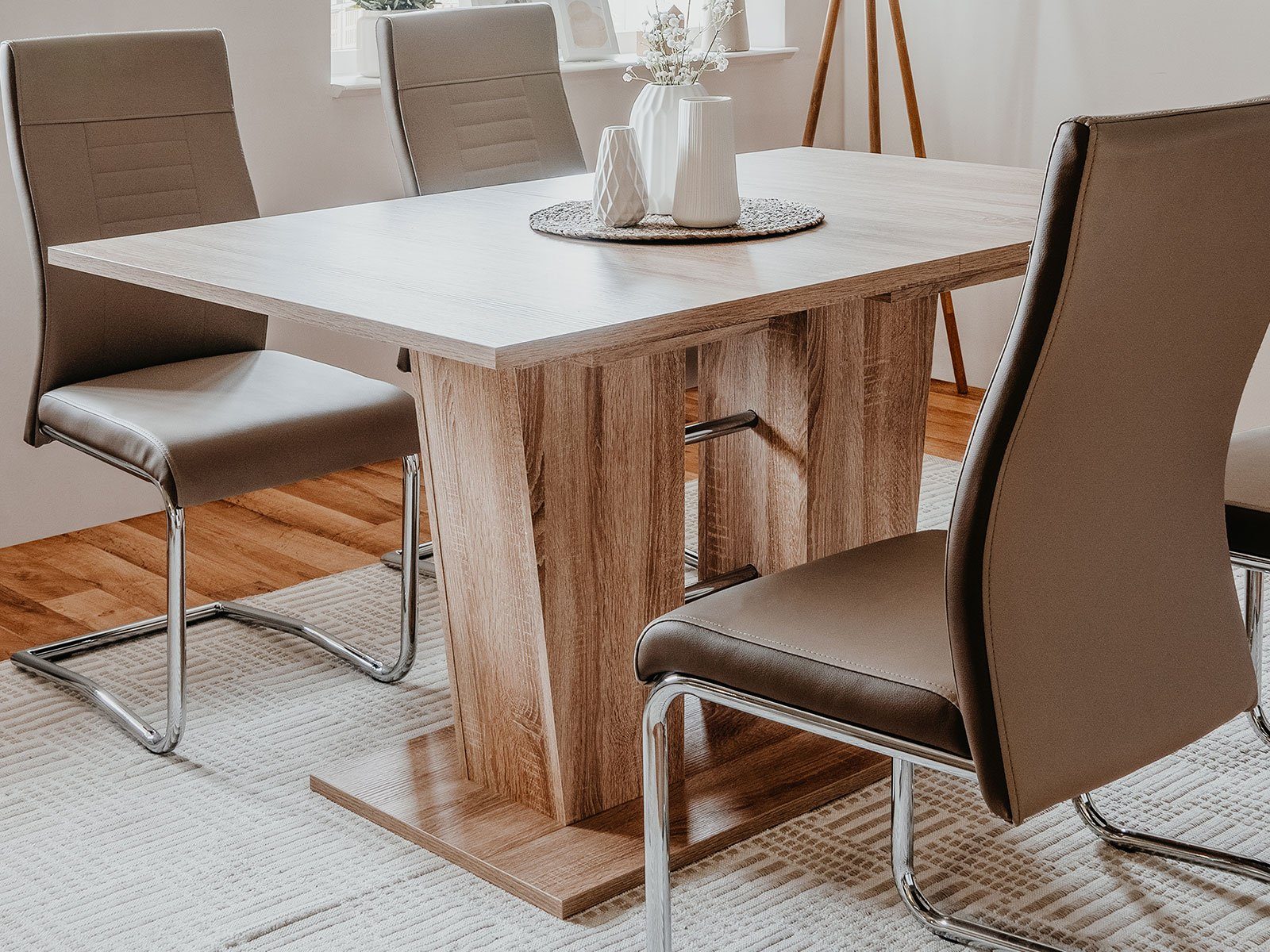 Du erhältst den Esszimmertisch "Bomuli I" in weiß oder Dekor Sonoma-Eiche. Die silberfarbenen Quertraversen in der Tischsäule verleihen "Bomuli I" einen Hauch von Extravaganz. Die erstklassige Verarbeitung bietet dir einen zeitgemäßen und dennoch zeitlosen Look, der sich perfekt in dein Wohnkonzept einfügt.