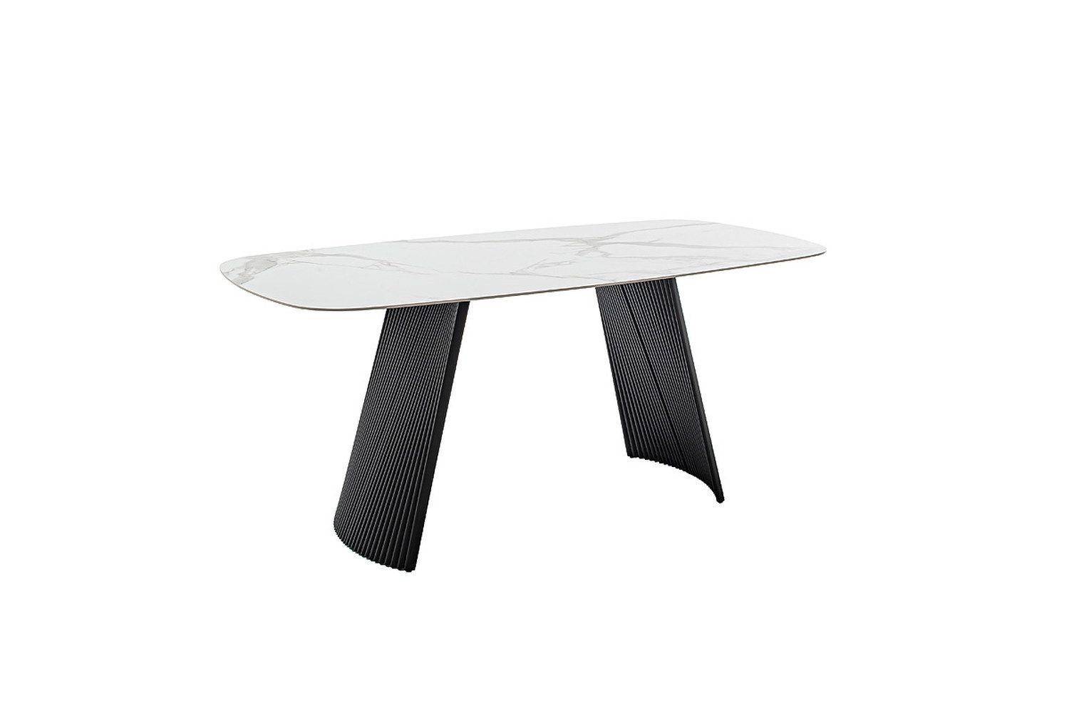 Der Esstisch TOBELO besticht durch seine moderne Eleganz und hohe Funktionalität. Die 180 cm breite und 90 cm tiefe Tischplatte besteht aus hochwertiger Keramik mit einer weiß marmorierten Oberfläche. Dies verleiht dem Tisch nicht nur eine edle Optik, sondern macht ihn auch besonders robust und widerstandsfähig. Die Materialstärke von 1,1 cm sorgt für eine langlebige und pflegeleichte Nutzung. Mit einer Tischhöhe von 76 cm bietet der TOBELO optimalen Komfort und genügend Platz für bis zu 8 Personen. Die abgerundeten Ecken unterstreichen das harmonische Design und erhöhen die Sicherheit. Das stabile Wangengestell des TOBELO besteht aus hochwertigem Metall, das in einem eleganten Schwarz matt lackiert ist. Diese Konstruktion gewährleistet eine hohe Standfestigkeit und eine maximale Belastbarkeit von bis zu 40 kg. Durch die klare Linienführung und das durchdachte Design fügt sich der Tisch nahtlos in verschiedenste Einrichtungsstile ein. Die Kombination aus Metall und Keramik macht den TOBELO besonders widerstandsfähig gegen Kratzer, Hitze und Flecken, wodurch er sich ideal für den Alltag eignet. Die Oberfläche der Keramik-Tischplatte ist besonders pflegeleicht und kann einfach mit einem feuchten Tuch gereinigt werden. Ihre weiß marmorierte Optik verleiht dem Esstisch eine zeitlose Eleganz, die sich hervorragend mit modernen oder klassischen Esszimmermöbeln kombinieren lässt. Die angenehme Haptik und die perfekte Kantengestaltung sorgen für eine hochwertige Verarbeitung, die den TOBELO zu einem echten Highlight macht. Die Tischhöhe bis zur Unterkante beträgt 74,9 cm, wodurch ausreichend Beinfreiheit gewährleistet wird. Der Esstisch TOBELO wird zerlegt geliefert, jedoch mit einer detaillierten Montageanleitung und dem notwendigen Montagematerial. Der Aufbau ist einfach und kann mit einer zweiten Person schnell durchgeführt werden. Dank der robusten Materialien und der hochwertigen Verarbeitung bietet der Tisch eine langlebige und stilvolle Ergänzung für jedes
