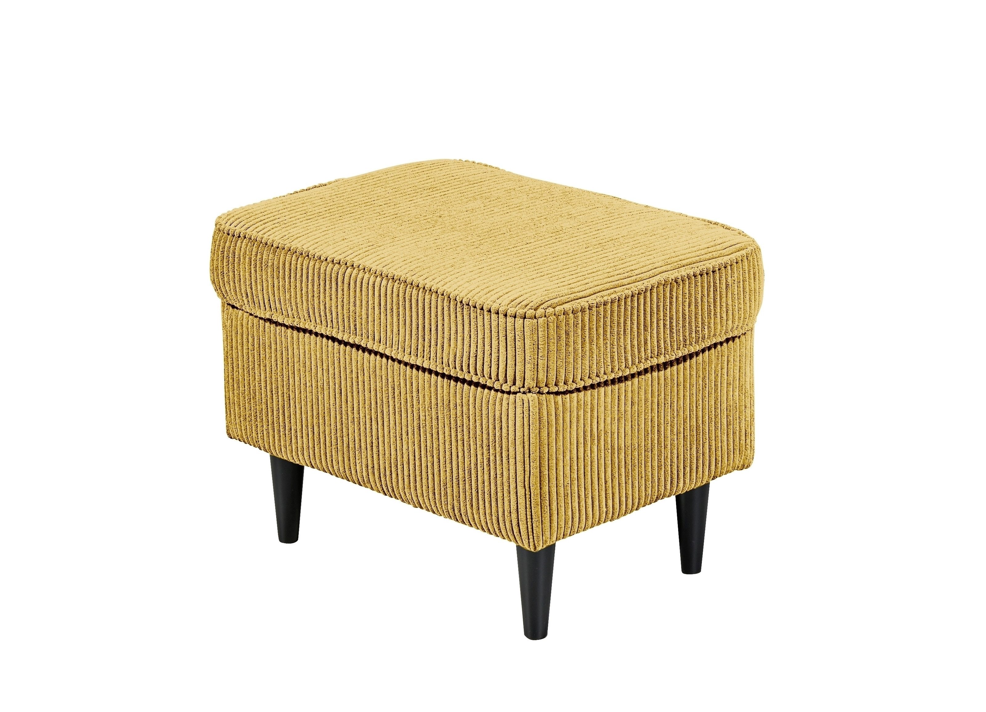 Die schwarzen Massivholzfüße des Hockers OSKAR verleihen dem Möbelstück nicht nur Stabilität, sondern setzen auch einen stilvollen Kontrast zum mustard des Bezugs.