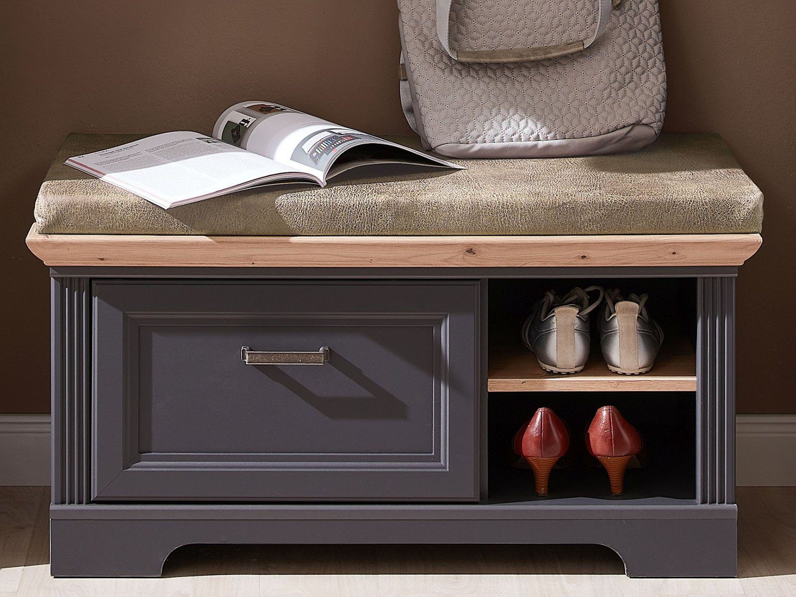 Die Garderobenbank "Jasmin I" ist hier in elegantem Graphit gehalten, welches stilsicher mit Absetzungen in vornehmer Artisan Eiche Nachbildung kombiniert wird. Insbesondere in Verbindung mit dem antiken Metallgriff, sowie den Ausfräsungen der Front wird der Garderobenbank eine ländlich angehauchte, heimelige Erscheinung verliehen. Die Holznachbildung ist qualitativ sehr hochwertig mit täuschend echter Maserung.