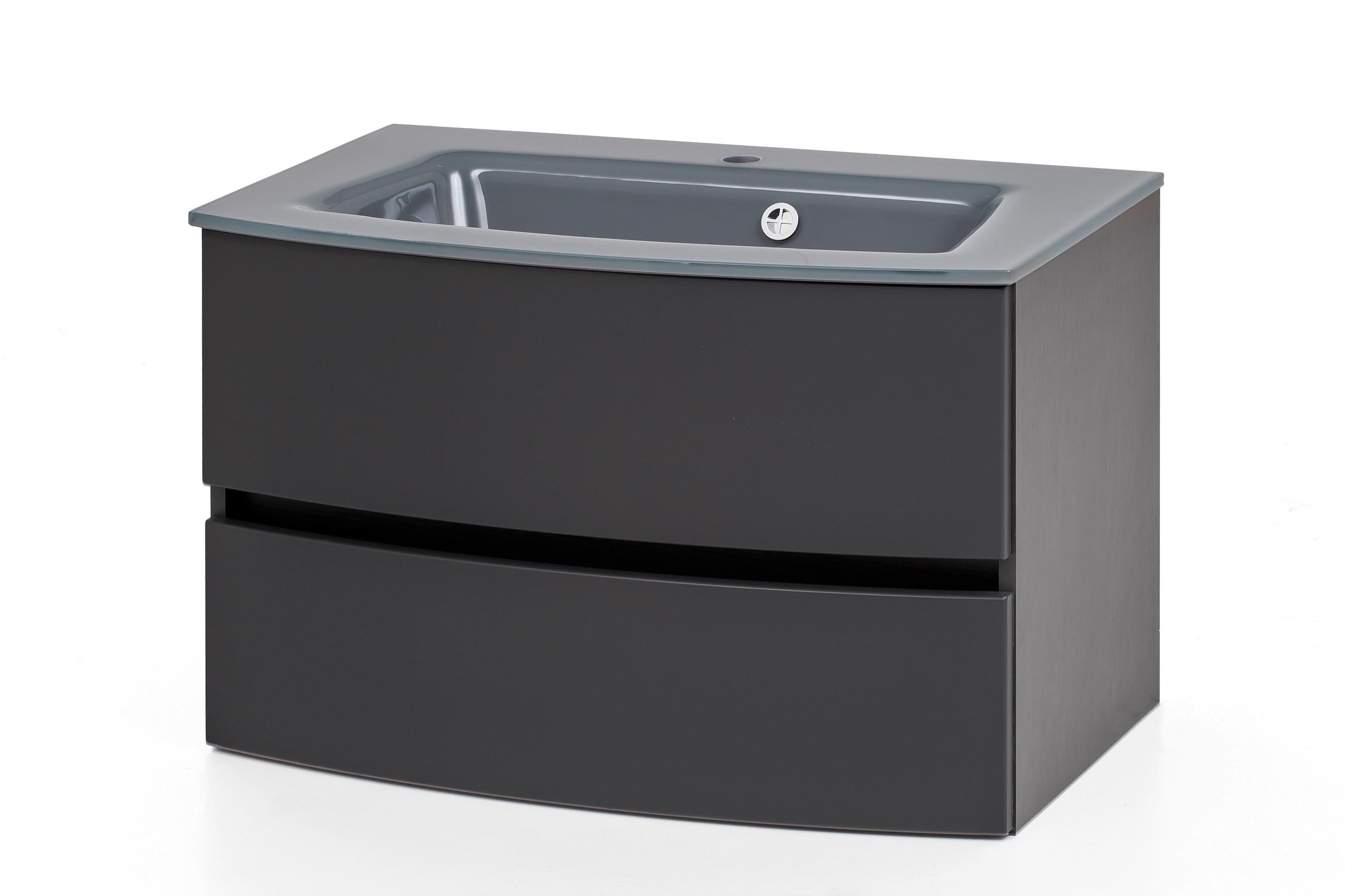Der Waschtisch "Kopenhagen II" ist mit einem Korpus in Grafitgrau erhältlich, welcher stilvoll mit einer Front in Matt Grau kombiniert wird. Das grifflose Design wertet die hochwertige Optik des Tisches zusätzlich auf. Das in grau gehaltene, gebogene Glaswaschbecken rundet das äußere Erscheinungsbild des Waschtisches gekonnt ab.