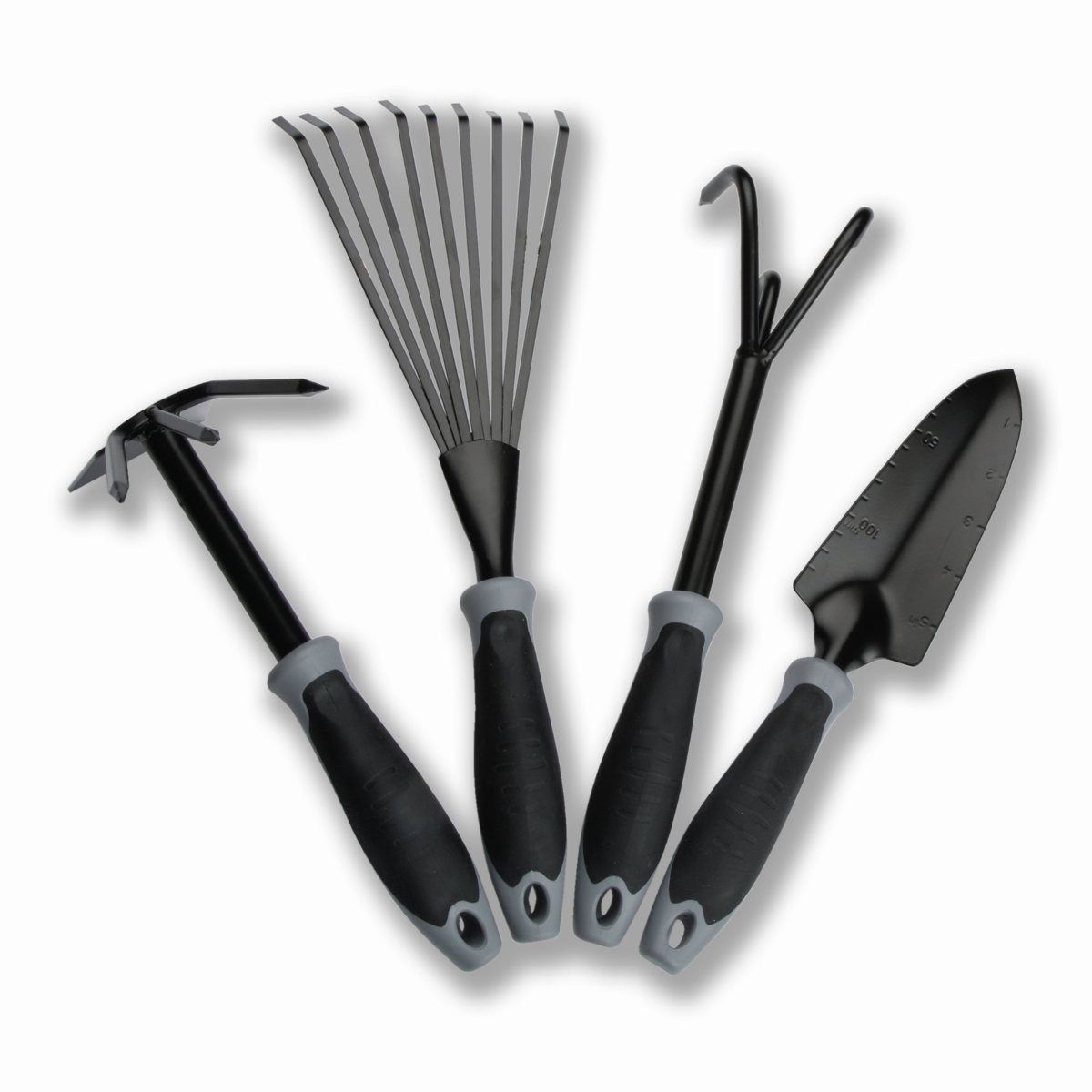 Das Grabpflege-Set besteht aus Blumenkelle, Häckchen, Laubbesen und Grubber.