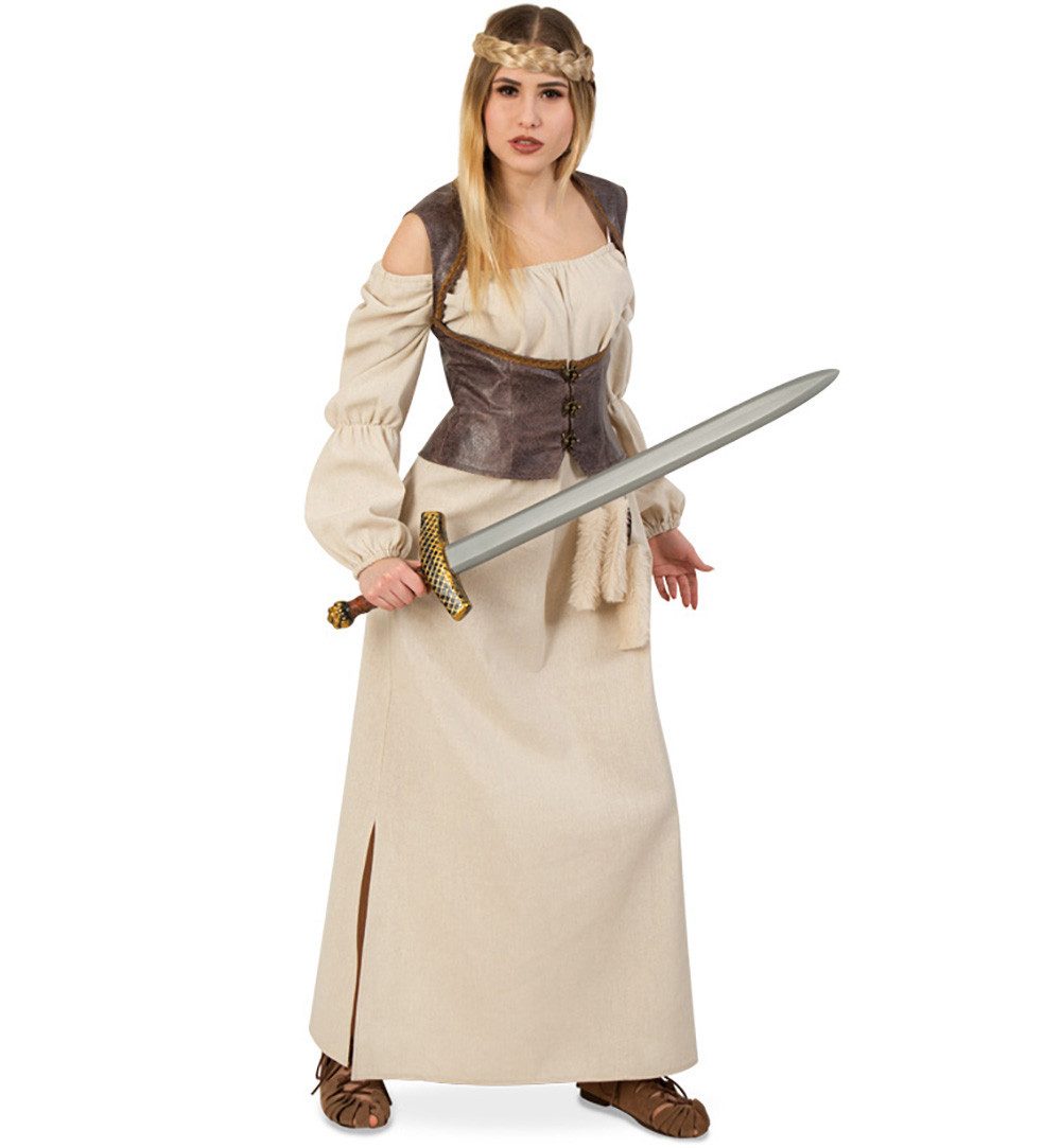 Sieglinde Nicht nur hochadelige Fräulein gab es im Mittelalter, sondern auch allerlei gewöhnliches Volk. Wer sich diesem eher zugehörig fühlt, der könnte an diesem Kleid Gefallen finden? Ganz aus einem etwas gröberen Webstoff gemacht und in natürlich wirkendem Beige, könnte es gut einer tapferen Wikinger Frau gehört haben. Der breite Halsausschnitt sowie Ellenbogen und Ärmelabschlüsse sind für einen schönen Sitz gerafft. Die figurbetonende Weste aus Kunstleder mit den Zierbommeln aus Kunstfell macht das Kleid zu etwas Besonderem für jede Gelegenheit zur historischen Verkleidung! Im Lieferumfang enthalten ist das Damen Kostüm Mittelalterkleid mit Mieder für Fasching, Karneval, JGA und andere Gelegenheiten. Material: Oberstoff beige: 60% Baumwolle 40% Polyester. Andere Stoffe 100% Polyester Für Fasching, Karneval, Mottoparty und andere Gelegenheiten
