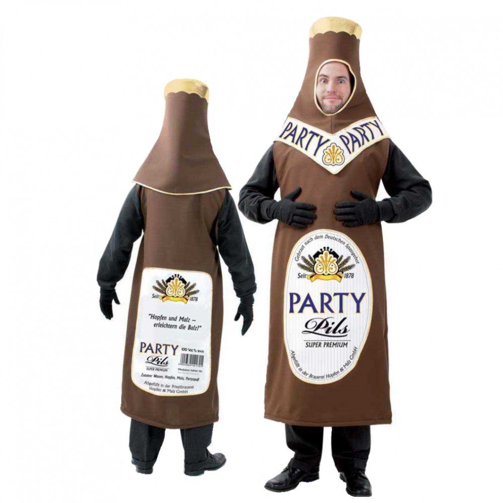 Zum Wohl! Mit diesem witzigen Spaßkostüm können Sie zu Fasching oder Mottoparty als Bierflasche herumlaufen. Das lange braune Gewand ist in Form einer Bierflasche geschnitten, die Gesichtspartien sind ausgespart und auf beiden Seiten sind XXL-Etiketten angebracht. Lieferung ohne schwarzes Langarm-Shirt und ohne Hose.