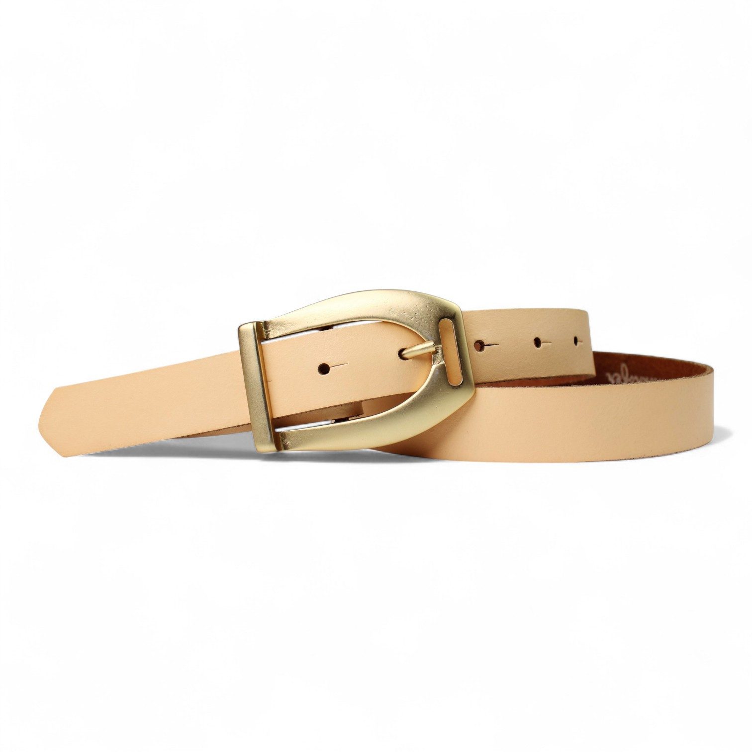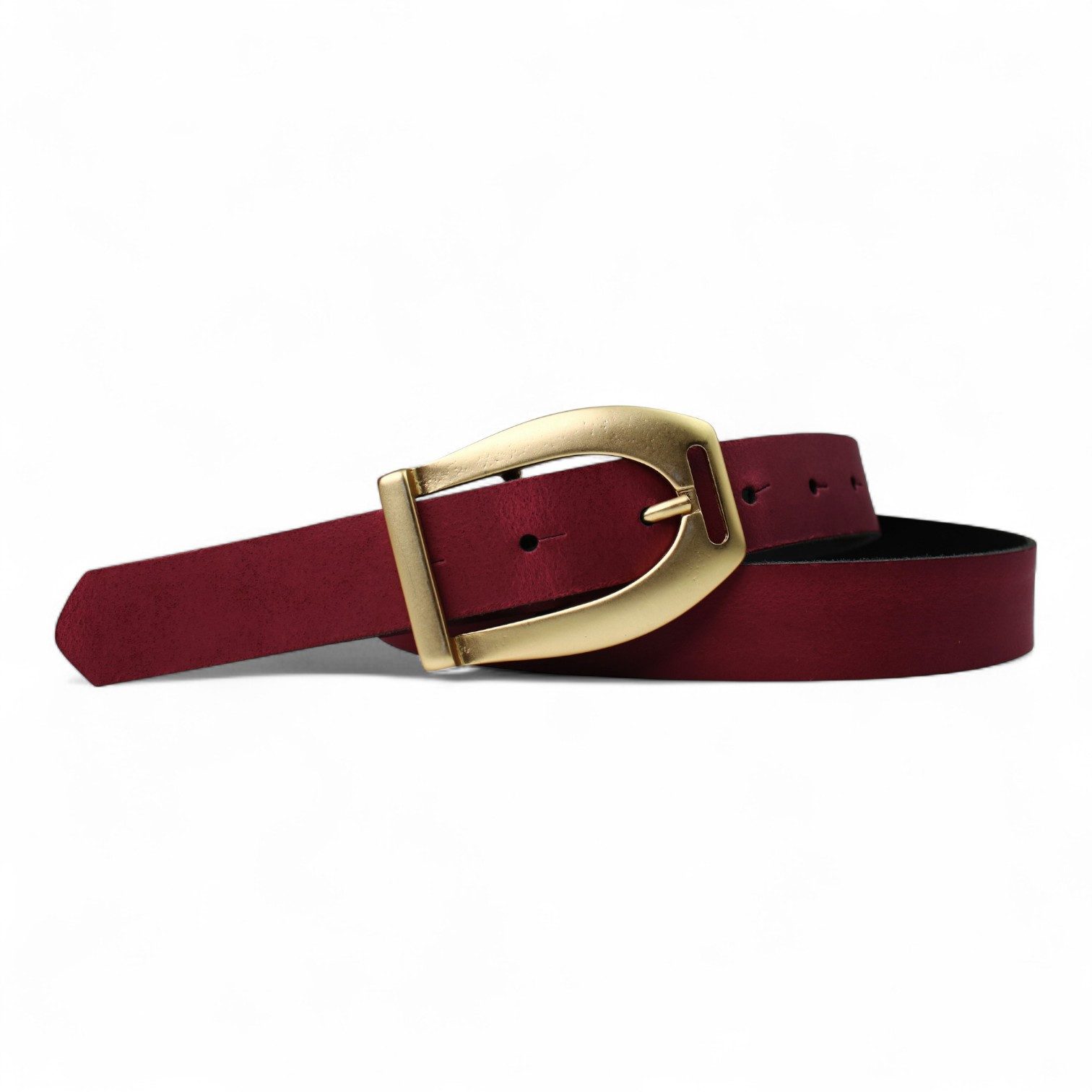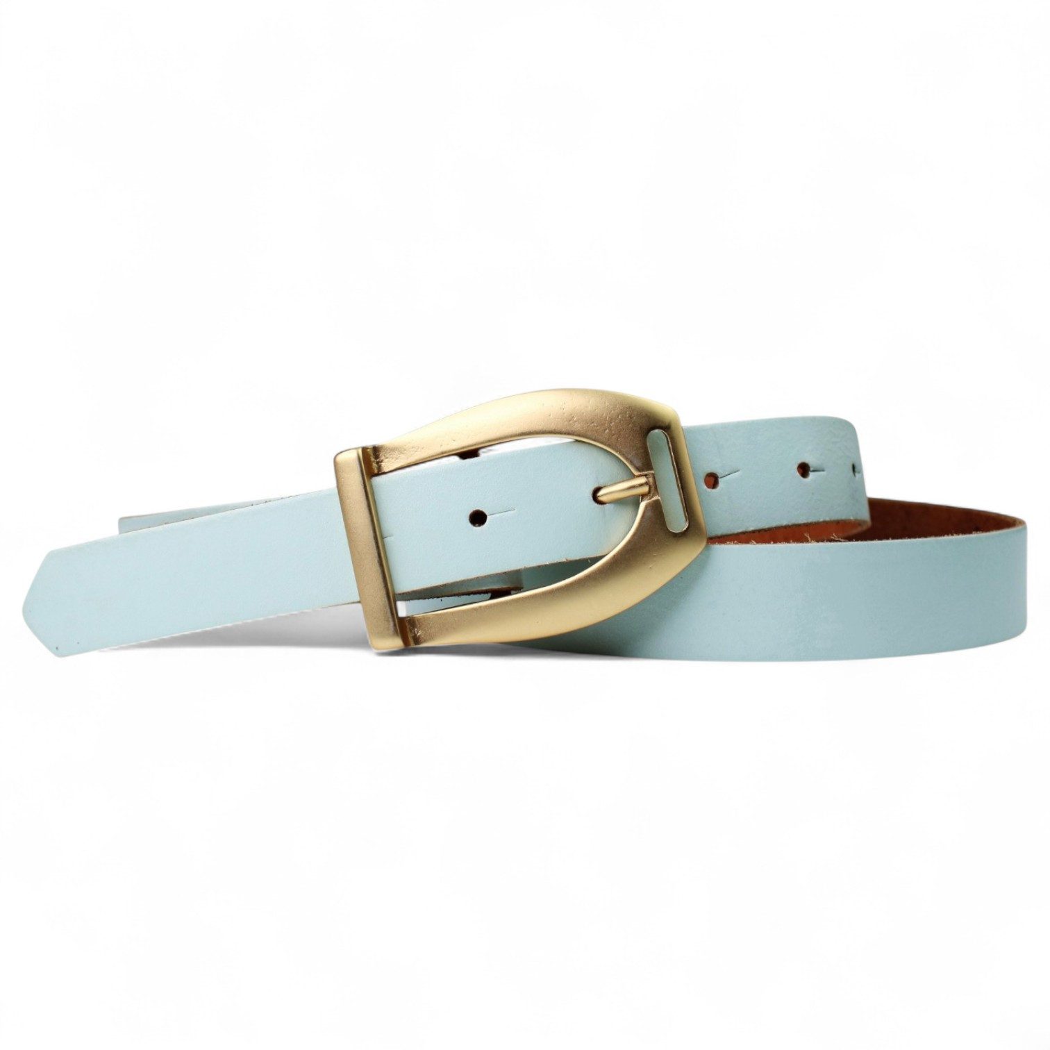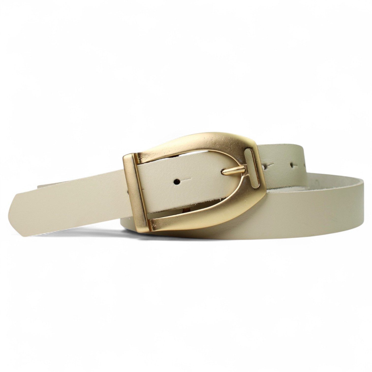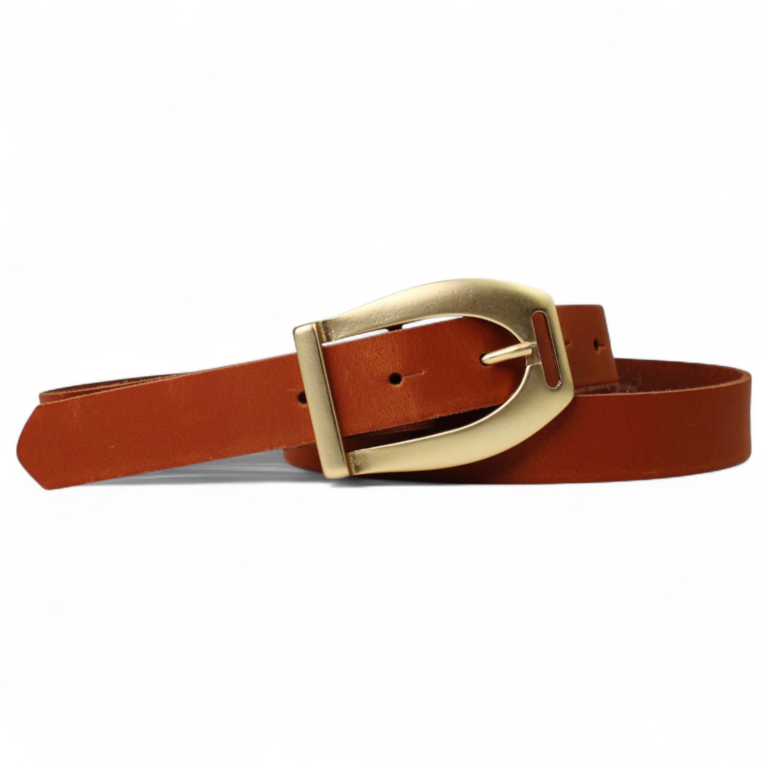 Exklusiver Damengürtel mit einer tollen Steigbügel-Gürtelschnalle in Mattgold. Der Gürtel kann hervorragend zu einer Vielzahl von Outfits kombiniert werden. Das Leder hat eine glatte Oberfläche und ist bewusst sehr dünn geschnitten (2-3mm) damit es flach und leicht ist und nicht aufträgt.