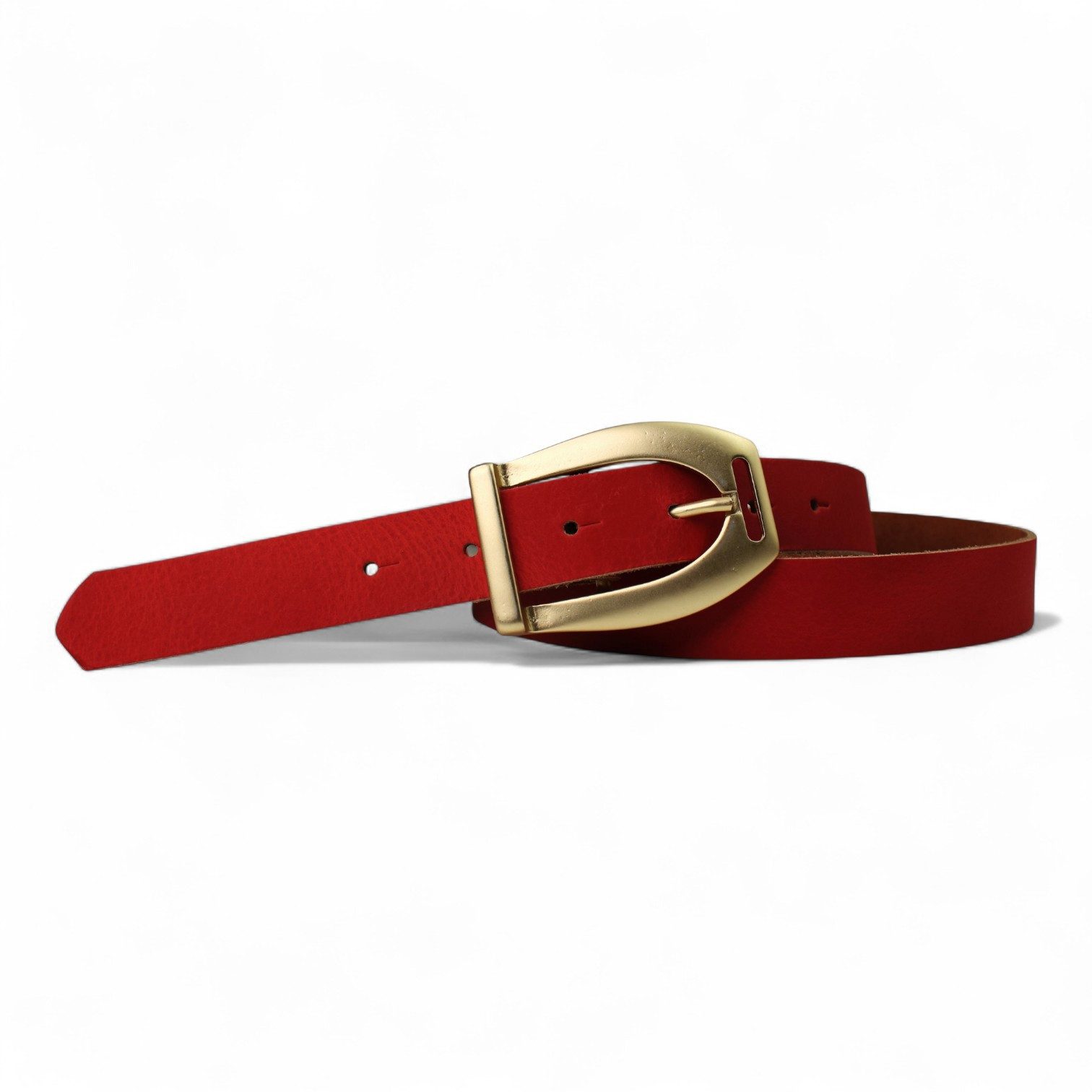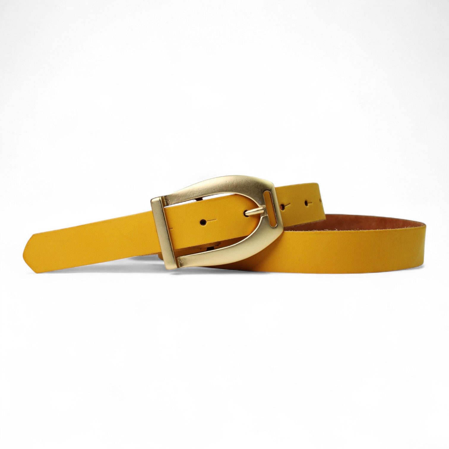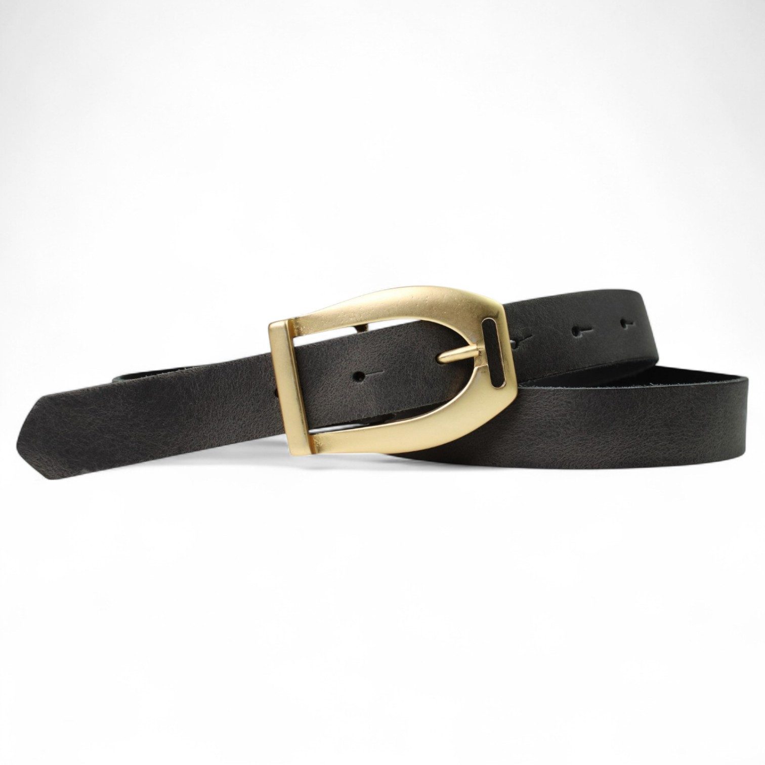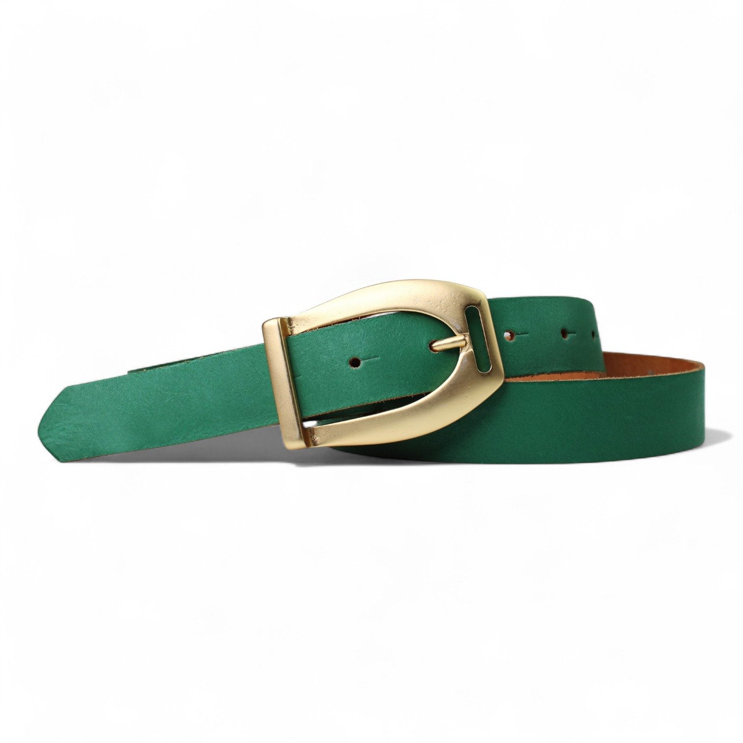 Exklusiver Damengürtel mit einer tollen Steigbügel-Gürtelschnalle in Mattgold. Der Gürtel kann hervorragend zu einer Vielzahl von Outfits kombiniert werden. Das Leder hat eine glatte Oberfläche und ist bewusst sehr dünn geschnitten (2-3mm) damit es flach und leicht ist und nicht aufträgt.