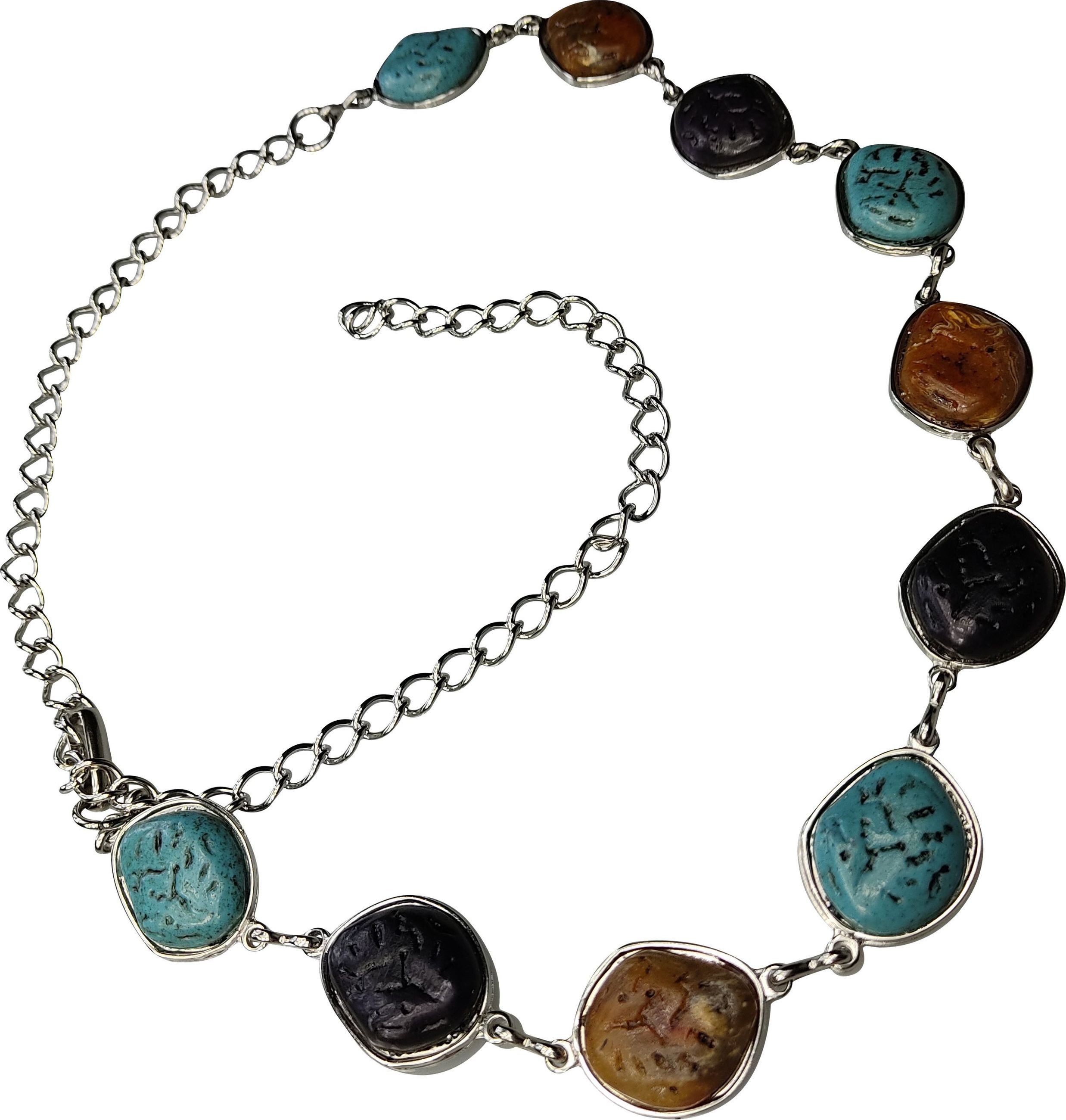 Besondere Merkmale | silberner Kettengürtel mit bunten, großen Steinchen |