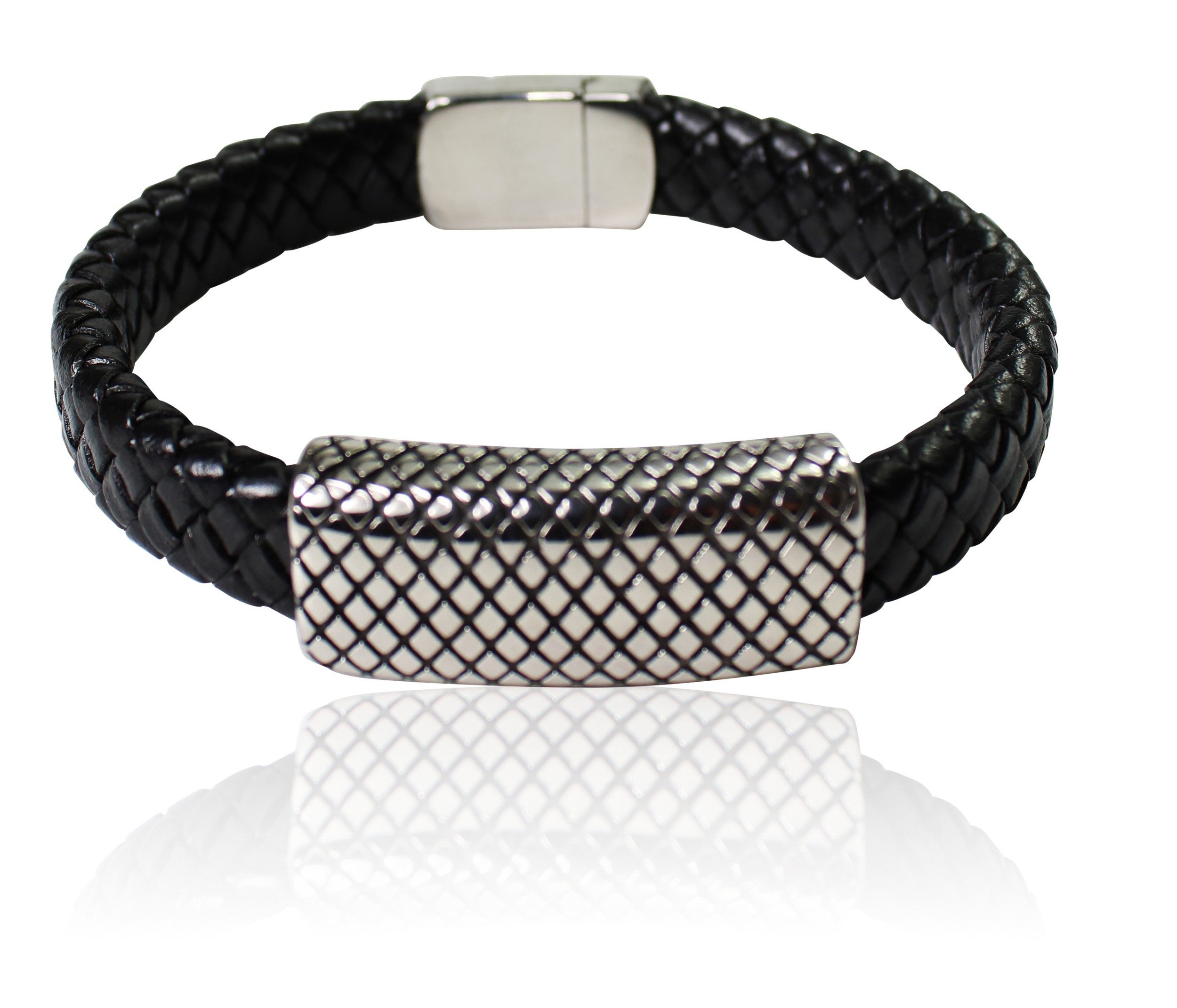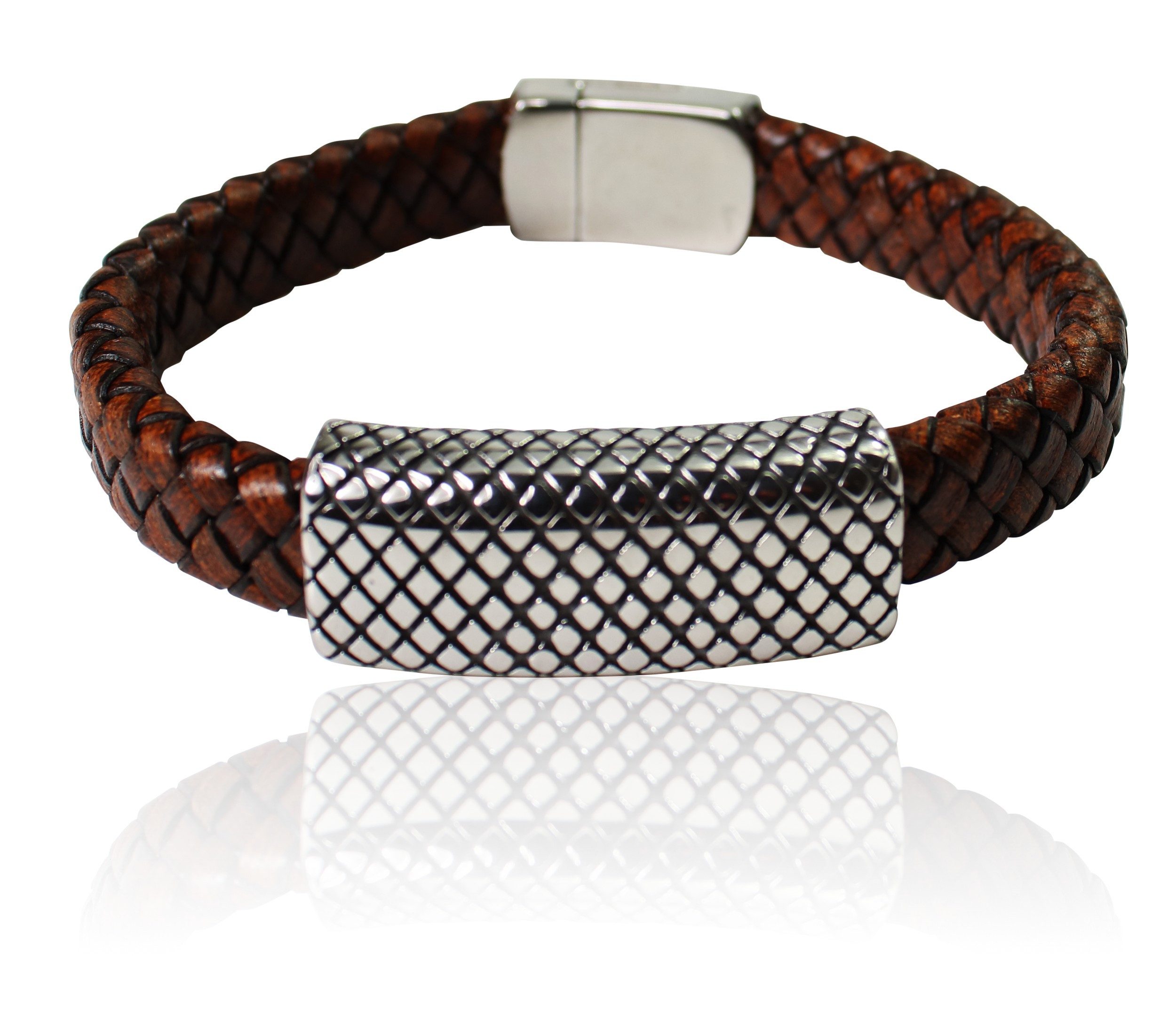 Markantes Lederarmband für Herren. Auf dem geflochtenen Lederband ist ein großes Metallteil zum Schieben angebracht. Mit einem schlichten, edlen Magnetverschluss ist das Armband leicht zu schnallen.