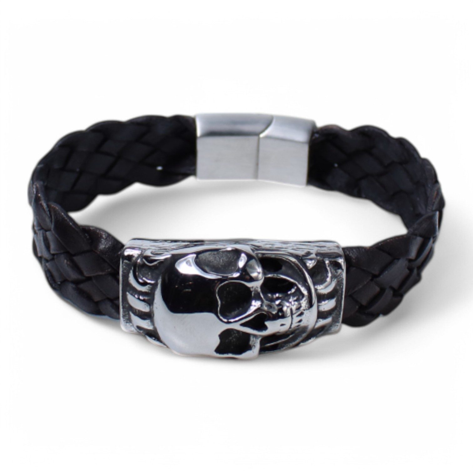 Markantes Lederarmband für Herren. Auf dem geflochtenen Lederband ist ein großes Metallteil (ca. 3,5 cm lang) zum Schieben angebracht. Der große Totenkopf aus Edelstahl wirkt maskulin und passt sehr gut zu dem schlichten, edlen Magnetverschluss.