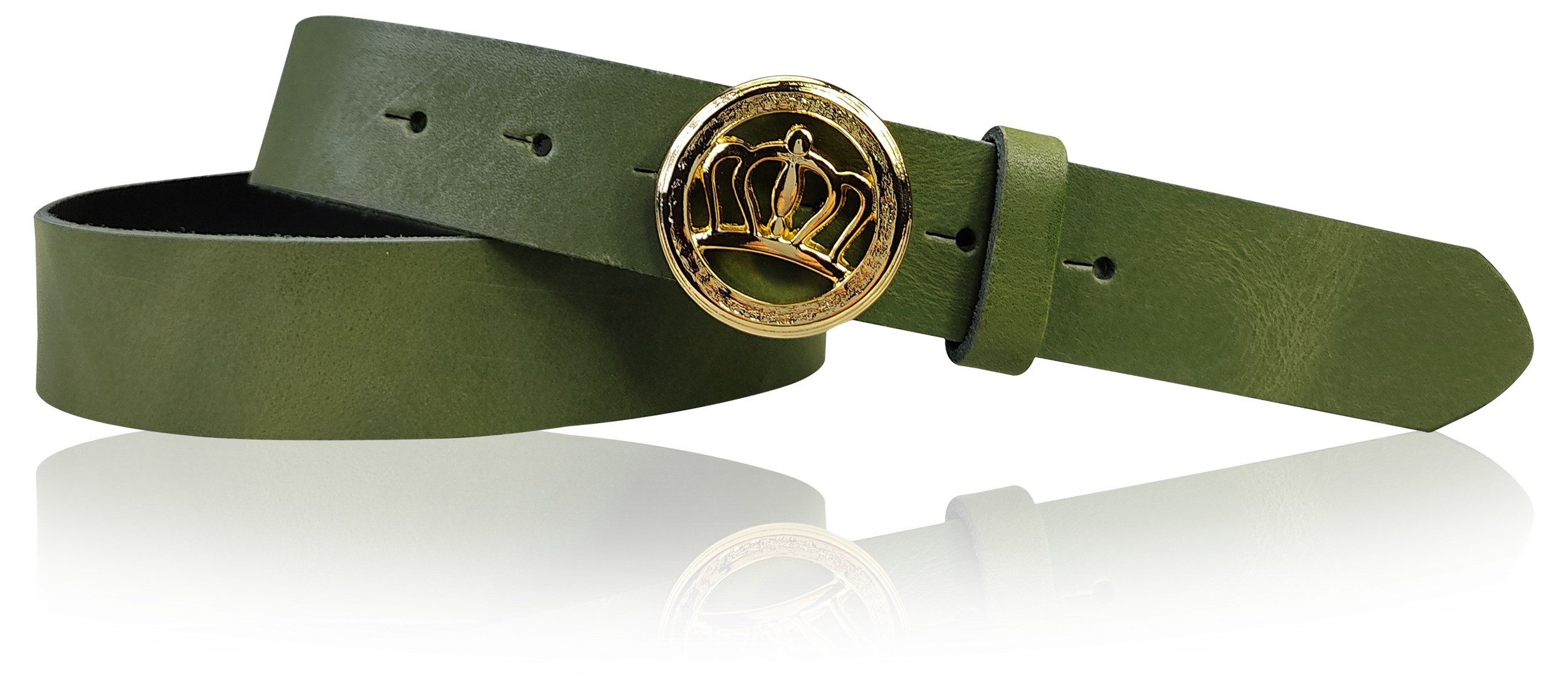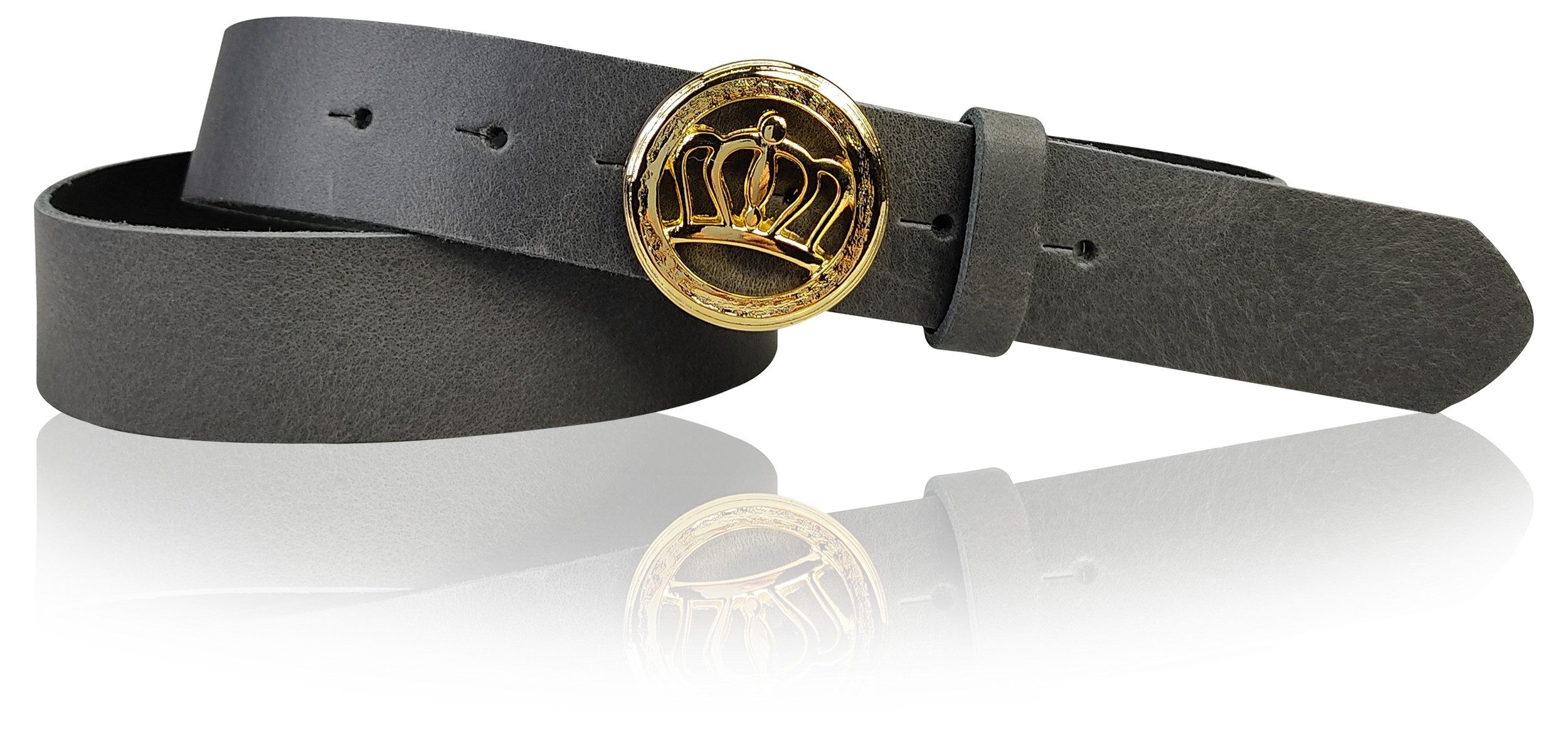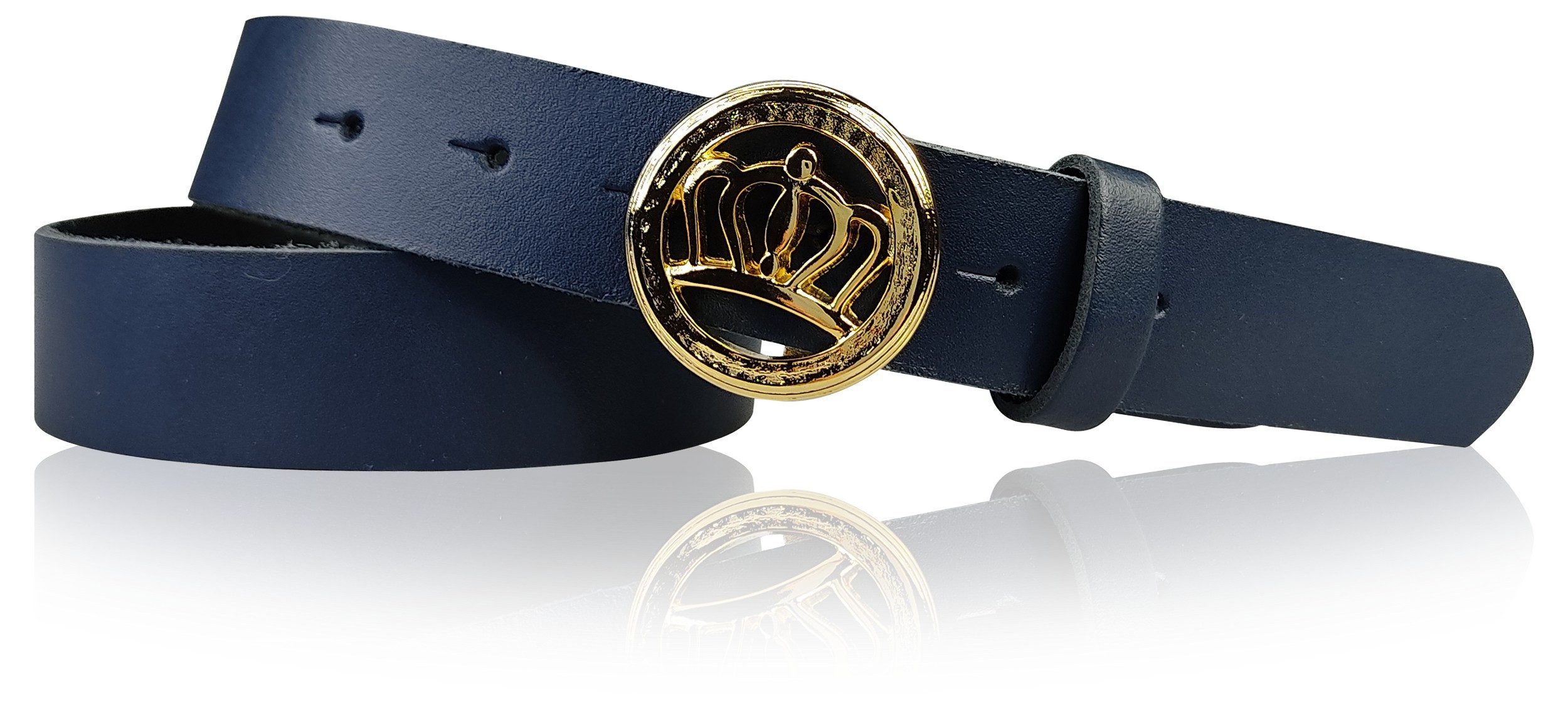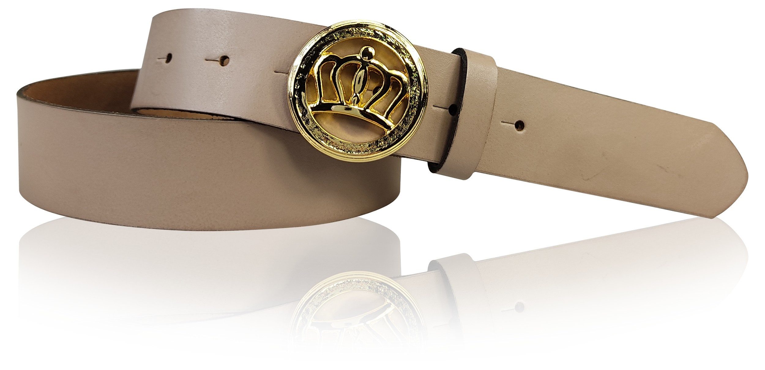 Femininer Damengürtel mit einer hübschen, runden Motivschnalle in gold. Die Krone bleibt immer elegant, der Gürtel passt gut zu Blazern und zu Businessoutfits. Die Schnalle kann mit dem Druckknopfsystem gewechselt werden. Der Gürtelriemen ist aus 100% echtem Leder.
