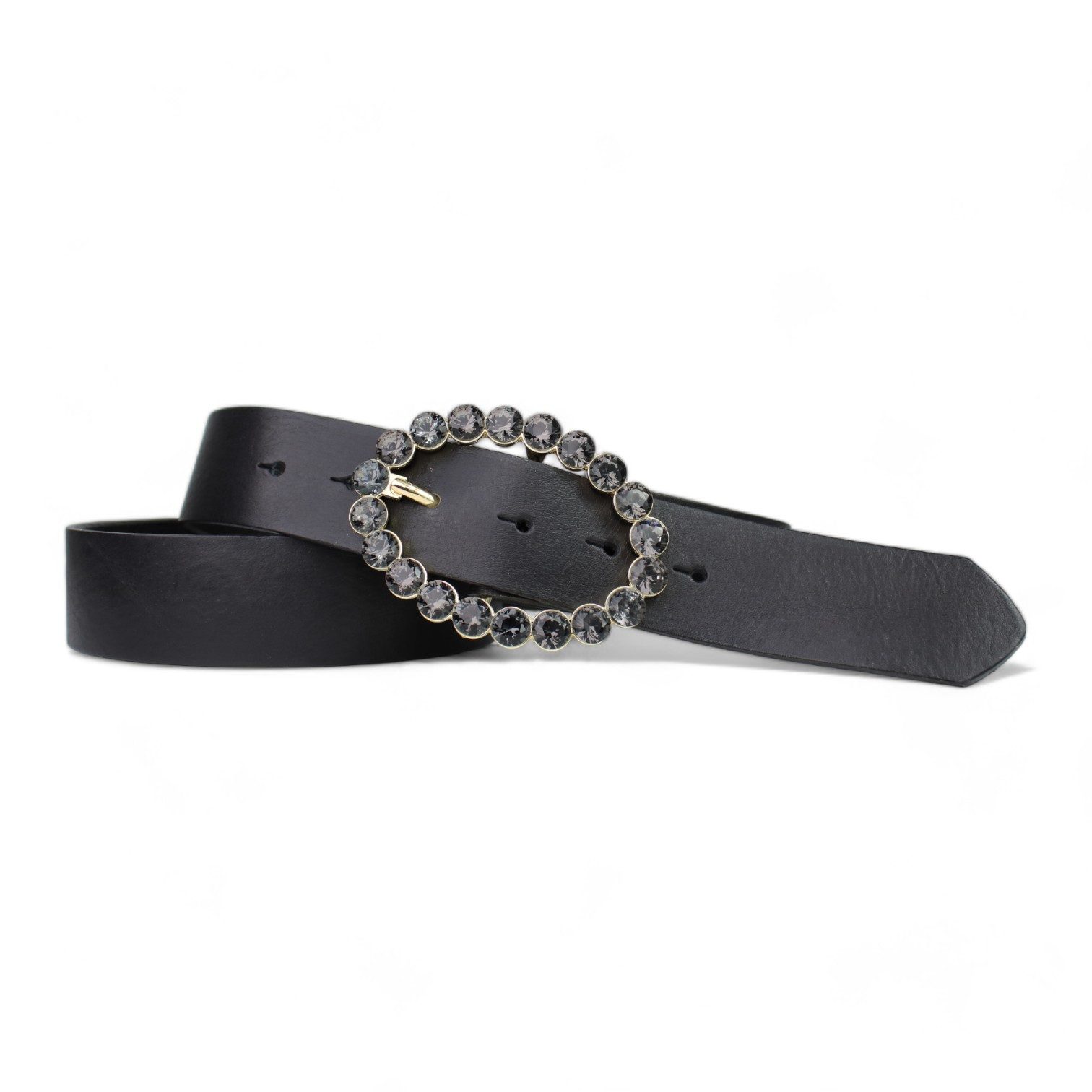 Femininer Damengürtel mit einer außergewöhnlichen Gürtelschnalle. In der ovalen, goldenen Schnalle sind viele schwarze Strasssteine rundherum eingearbeitet, Eine Schnalle, die sowohl casual als auch elegant kombiniert werden kann. Die Gürtelschnalle ist laut Hersteller nickelfrei.
