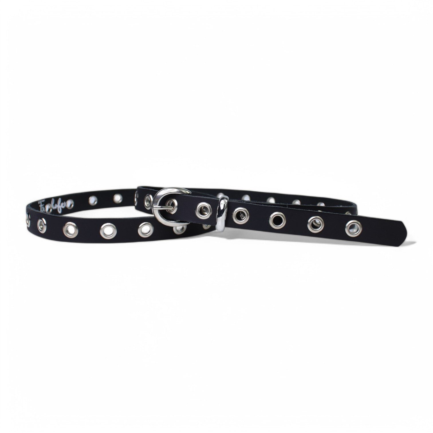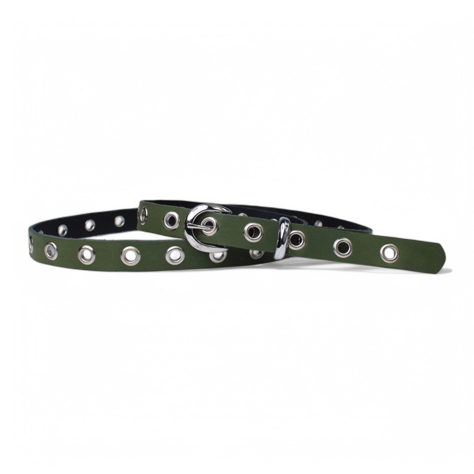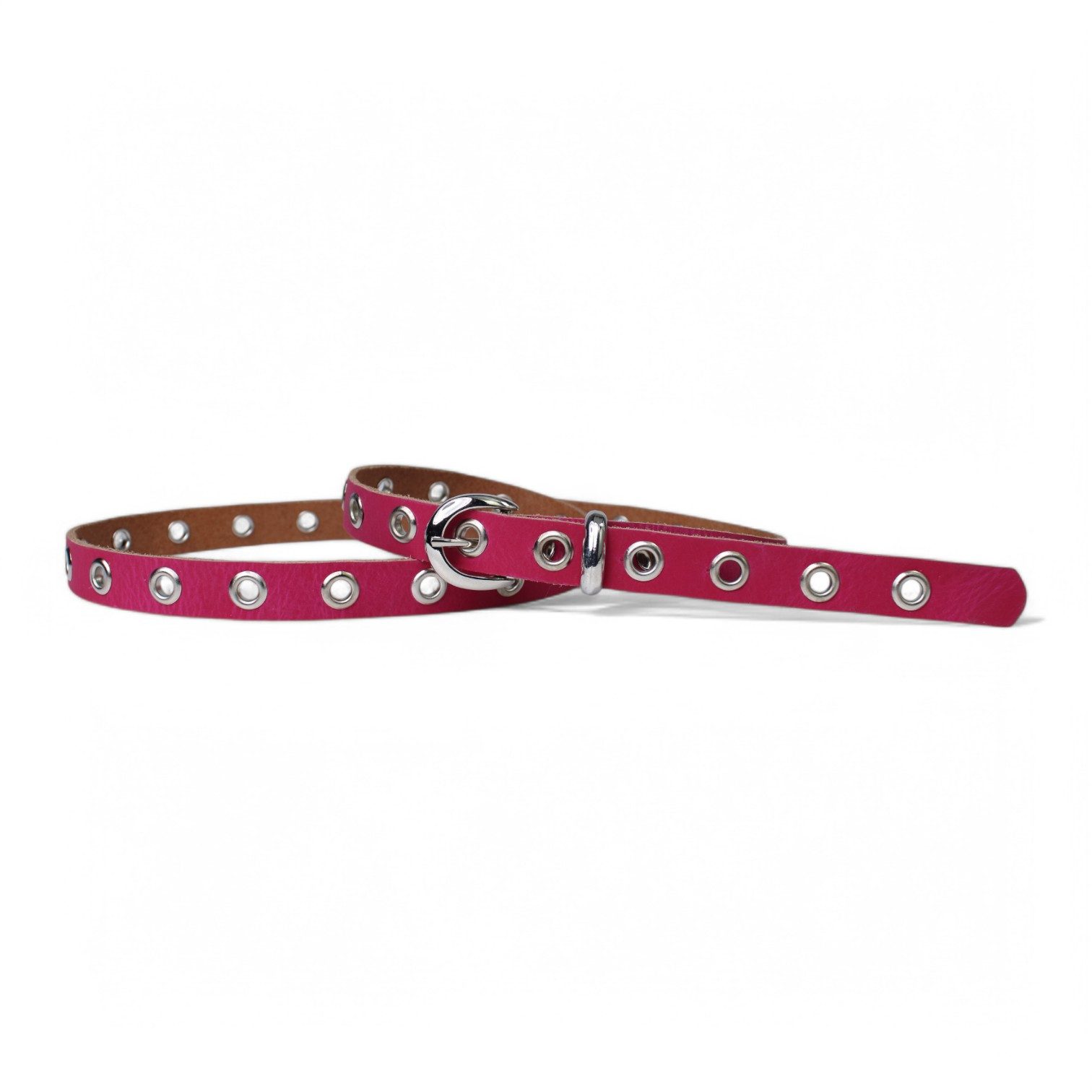 Schmaler Damengürtel mit Ösen und silberner Dornschnalle & passender Schlaufe. Die silbernen Ösen sind durchgehen am Riemen und machen aus dem süßen Gürtel einen Trendsetter.