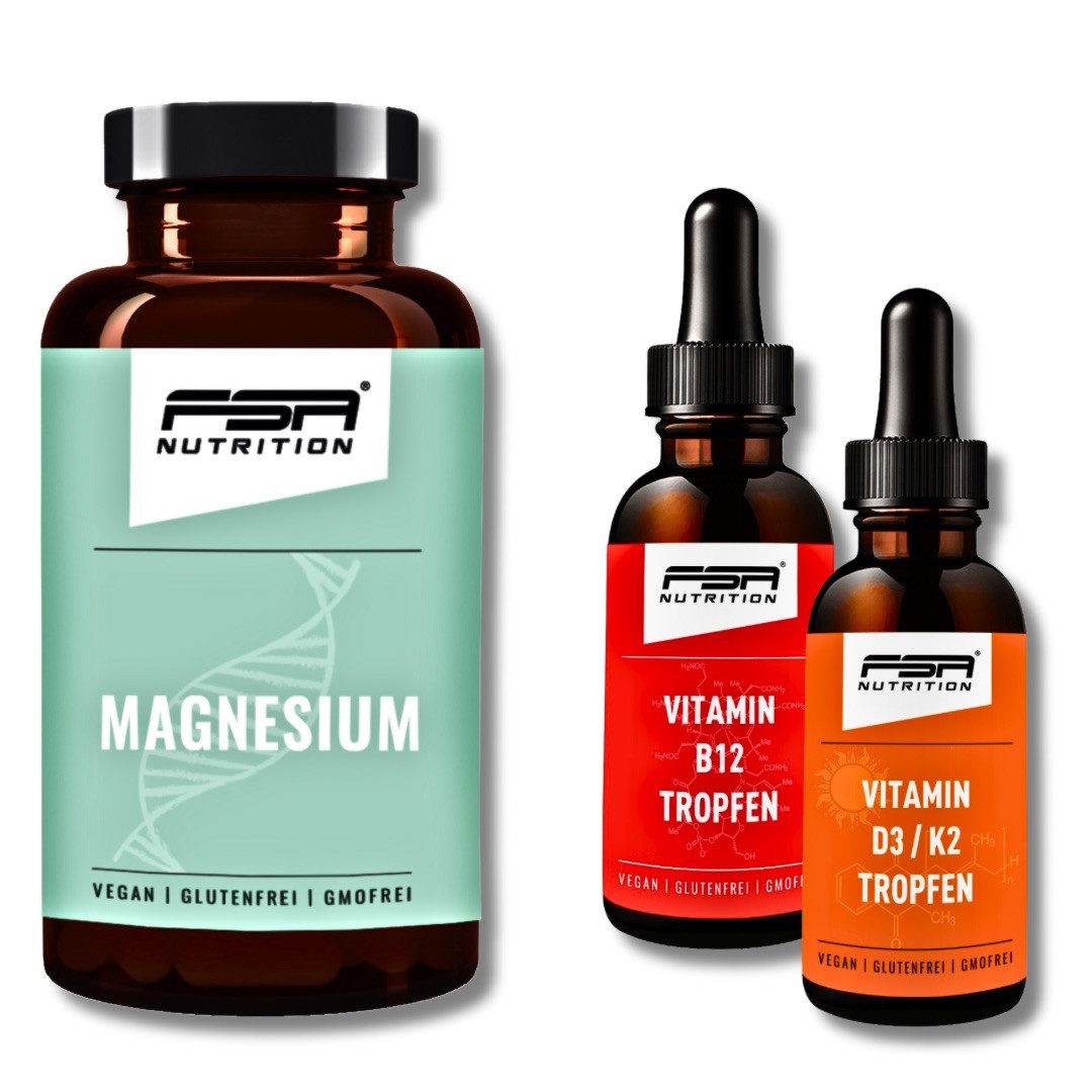 Dosierungsempfehlung | Magnesium: Täglich 2 Kapseln unzerkaut mit ausreichend Wasser. Vitamin D3 K2: 1 Tropfen täglich einnehmen. Vitamin B12: 2 Tropfen täglich einnehmen. |
