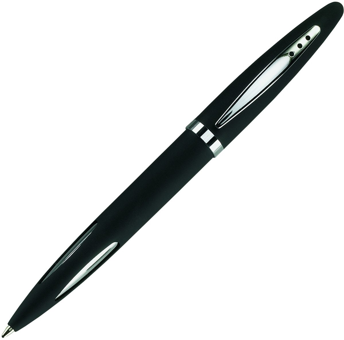 • Kugelschreiber matt-schwarz mit hochglanzverchromten Aussparungen im Unterteil in einem sehr ansprechenden futuristischen Design, mit Drehmechanik und Großraummine, im