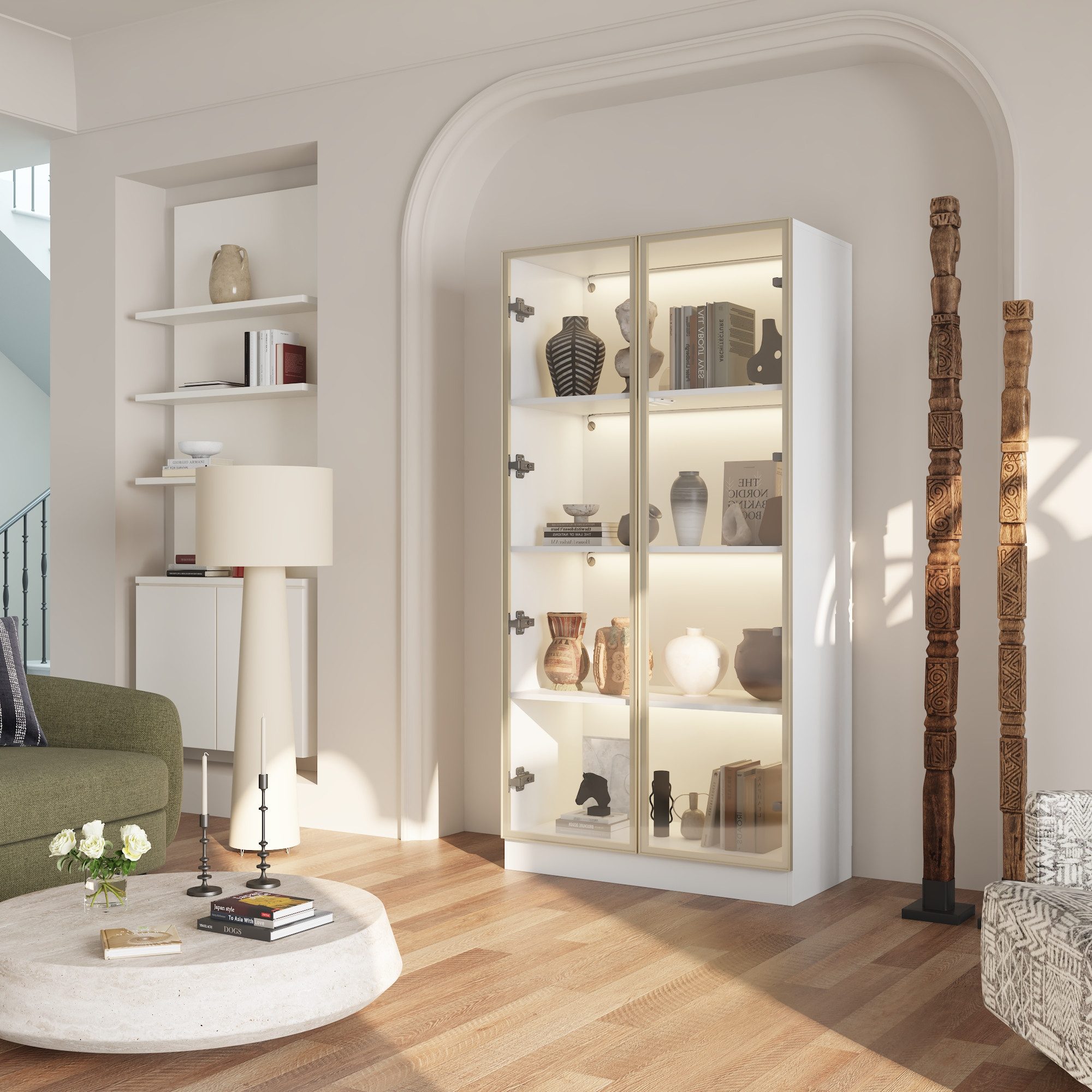 Diese stilvolle Vitrine mit Glastüren ist ein vielseitiges Möbelstück für jedes Zuhause. Hergestellt aus robustem MDF und Glas, bietet sie mit 80×40×160 cm großzügigen Stauraum auf vier Ebenen. Die LED-Beleuchtung mit drei Lichtfarben (kaltweiß, neutralweiß, warmweiß) ist unter jedem Regalboden integriert und bringt Ihre Bücher, Dekoration, Geschirr oder Sammlerstücke perfekt zur Geltung. Dank der beiden Push-to-Open-Mechanismen lassen sich die Türen komfortabel öffnen, ganz ohne Griffe.